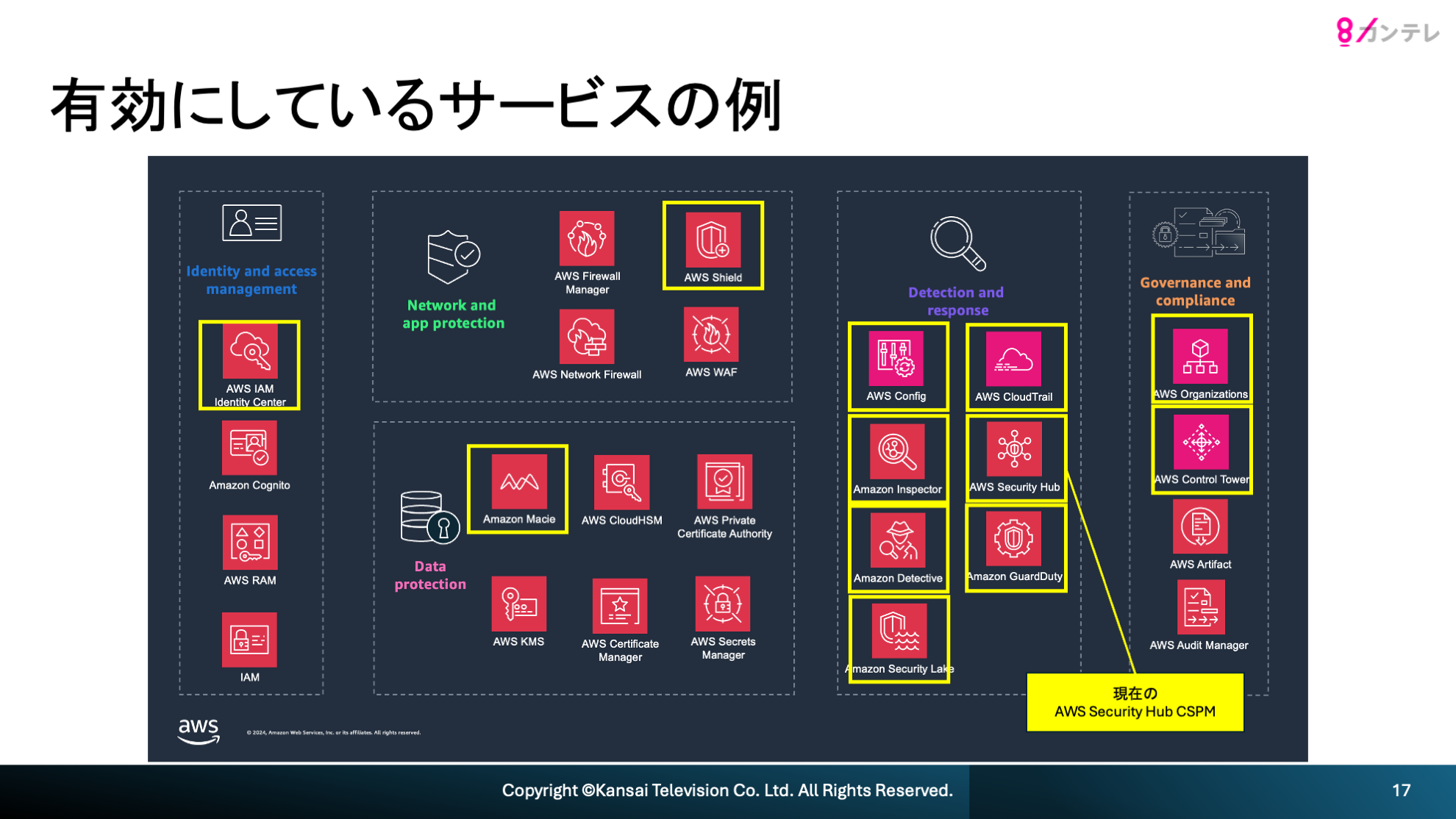 - 在阪放送局セキュリティガイドラインに基づいた Amazon GuardDuty, AWS Security Hub CSPM, AWS IAM Access Analyzer 等の AWS のセキュリティ、アイデンティティ、ガバナンスサービスの有効化