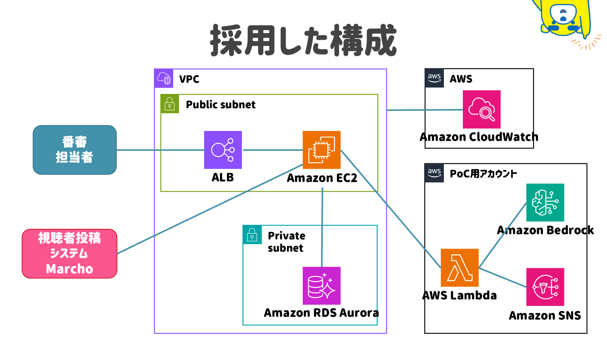 内製の取り組みを進める中で最近開発したのは、電話や FAX 等を介して視聴者から寄せられるご意見を集約する「番審システム 」です。AI の手を借りた Vibe Coding へのチャレンジや AWS Cloud Development Kit (CDK) によるインフラストラクチャーの開発、CI/CD パイプラインを用いたデプロイもこのプロジェクトの中で実現しており、ベンダーに外注する場合と比べて数週間単位でスケジュールを短縮することができました。DevSecOps の考え方にも注力しており、現在の CI/CD パイプラインをより強化していくことも今後予定しています。