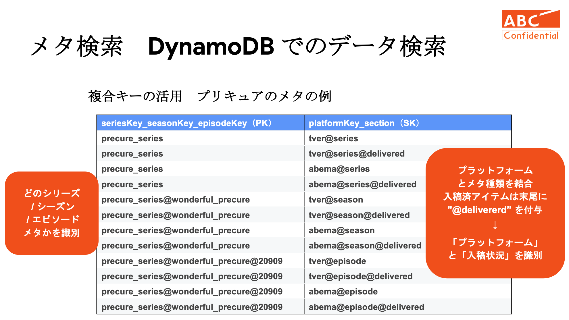 本システムに登録されている2万件を超える放送素材の中から、社内ユーザーは出演者などをキーに必要な素材の検索を行いますが、これらのメタデータの蓄積や検索を、これまで使っていた Amazon RDS ではなく Amazon DynamoDB を用いて実現したことが今回のシステム刷新の中での最大のチャレンジでした。放送素材は通常、シリーズ、シーズン、エピソードという3つの階層で管理されていますが、これを一つのパーティションキーで管理したり、配信先や入稿済みかどうかの情報も一つのソートキーで管理したりするなど、複数の情報を複合キーで表現することや、グローバルセカンダリインデックスを活用することで、ランニングコストの低い Amazon DynamoDB 上で、複雑なクエリを高速に実行することを可能としました。