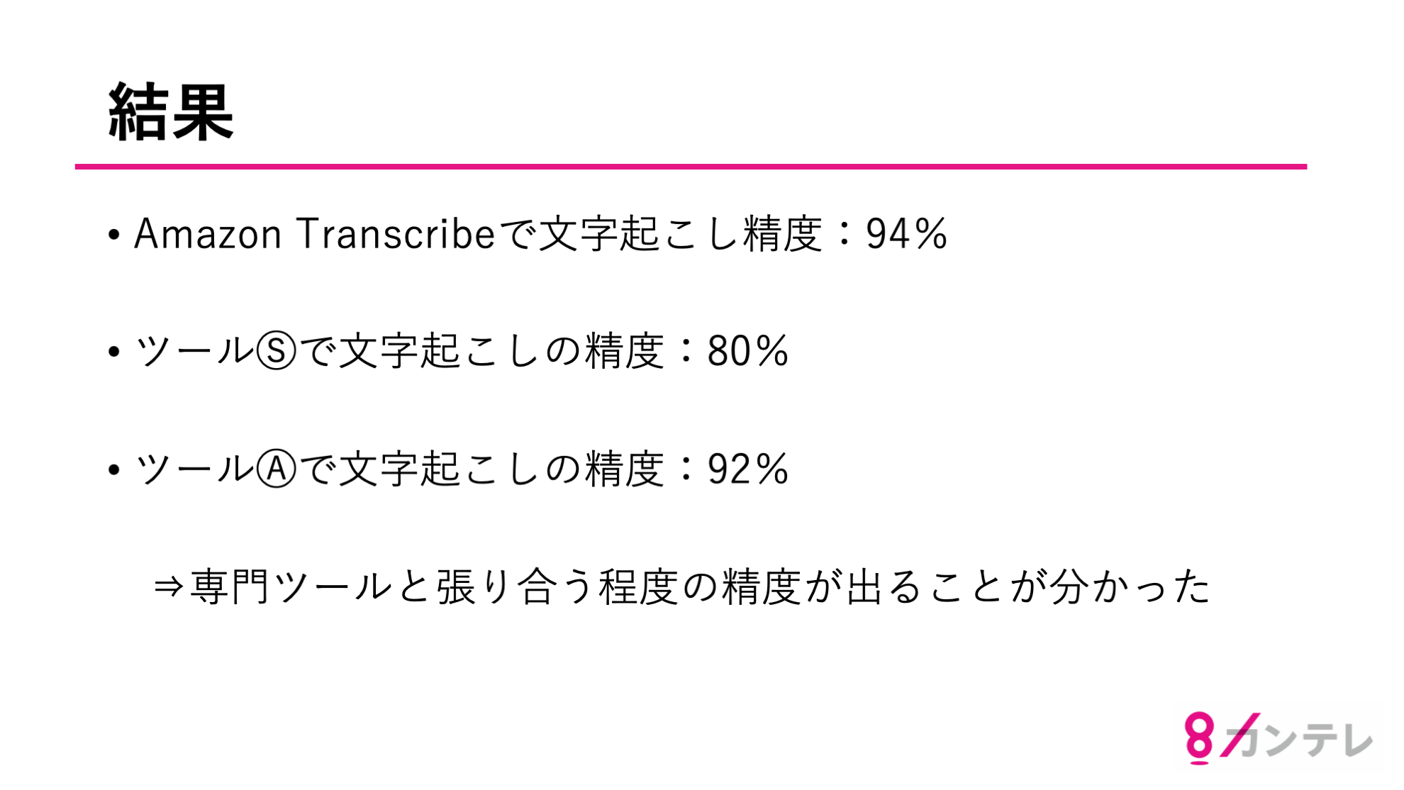 今回は社内の人間に関西弁で話をしてもらい、これを正しく文字起こしできるかを確認しました。1分程度の素材の場合、出力結果が出るまで20-30秒掛かりました。他の文字起こしツールと比べても Amazon Transcribe の出力結果の精度は良く、専門ツールと張り合うことが可能な精度であると感じています。ファイルを入力する場合、一般ユーザーが Amazon S3 にファイルをアップロードすることに障壁があると感じていて、ユーザーに使い勝手の良い Web アプリ等を作成して、その裏側で Amazon Transcribe を動かすような実装が必要になりそうだと考えています。
