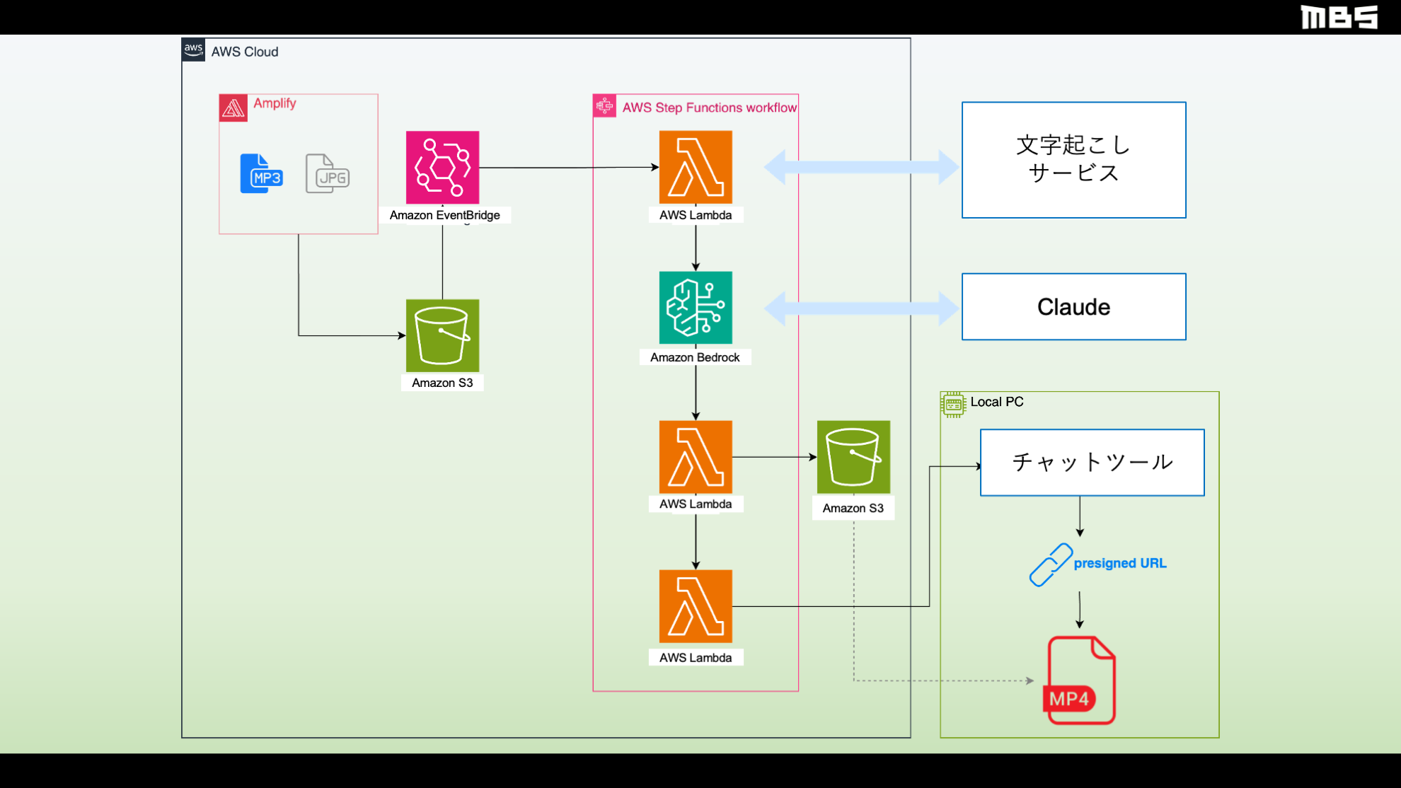 Web アプリとして構築したことにより場所を問わず作業が可能になったことと、サーバーレスアーキテクチャの採用によって作業への立ち合いなどの作業負荷や AWS の利用コストを低減できたことが本システムの大きな特徴です。映像素材の変換には AWS Elemental MediaConvert を、動画の合成処理には AWS Lambda を利用しており、MediaConvert 上の変換処理が終了すると Amazon EventBridge 経由でイベントが発火し、AWS Lambda を用いた後処理を自動で開始できるようにしています。