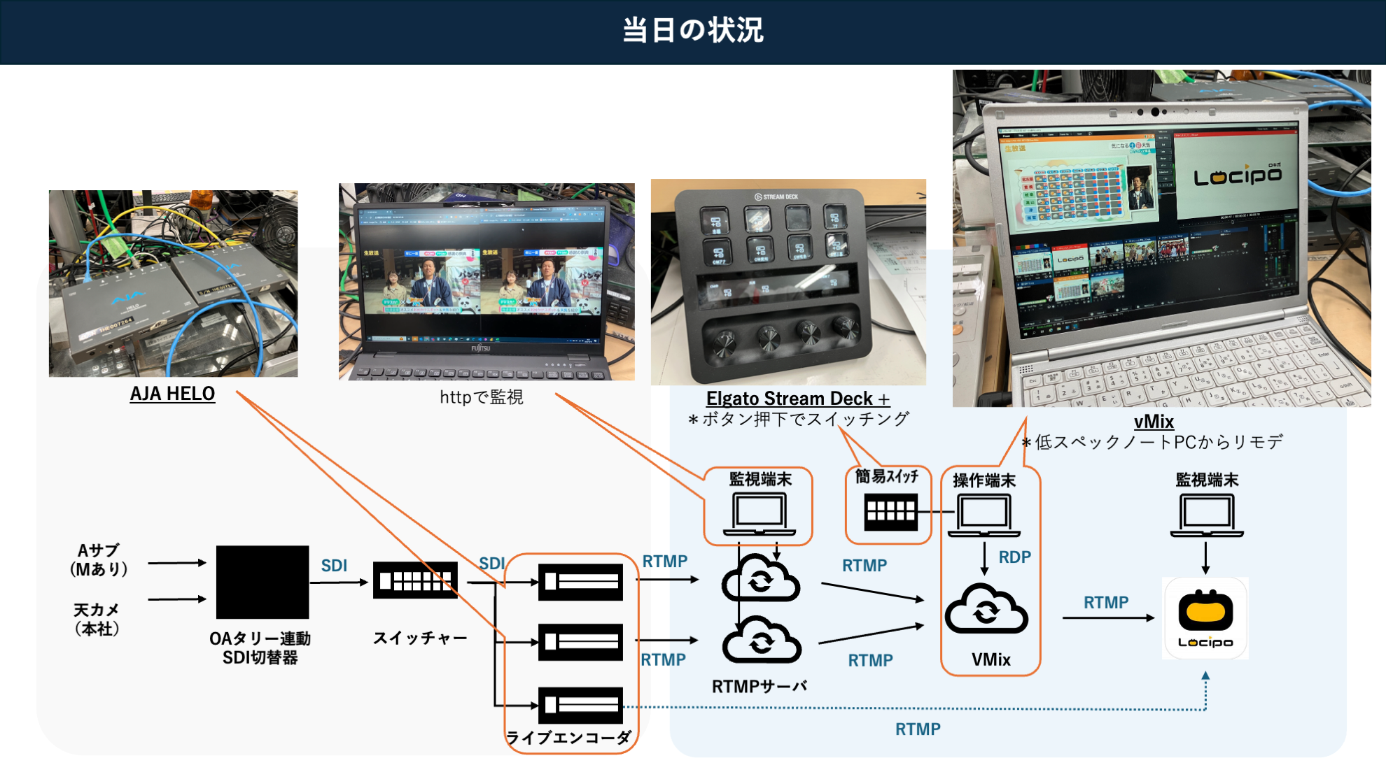 ケーブルレスでの制作環境の構築やクラウド上のソフトウェアスイッチャーを用いたコンテンツ制作の知見を蓄積するために、Amazon EC2 上でソフトウェアスイッチャーの vMix を動かし、その映像を動画配信サイト Locipo で配信するということにチャレンジしました。vMix の操作は Stream Deck と呼ばれる物理スイッチを使ってリモートから行っていますが操作性に問題はありませんでした。