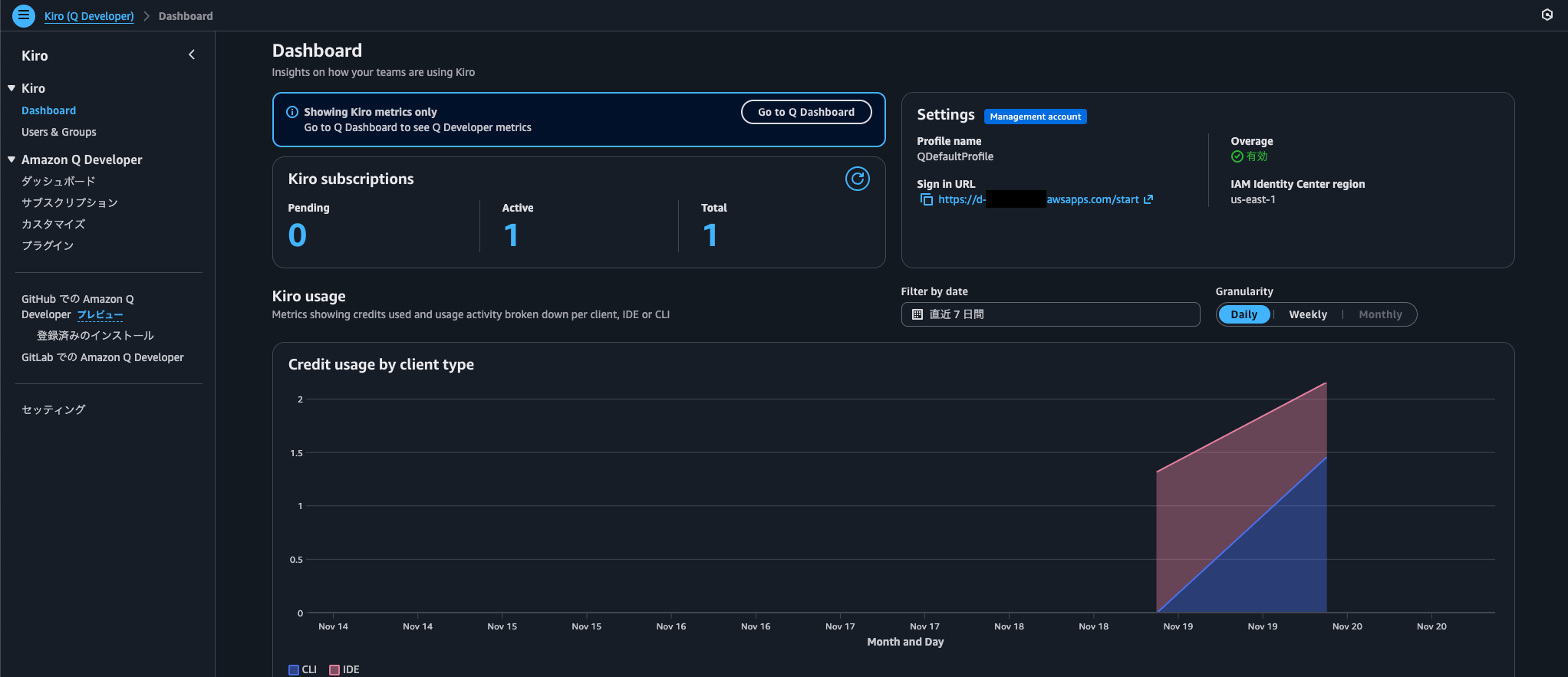 Kiro のダッシュボードとメトリクスの詳細は「Viewing Kiro usage on the dashboard – CLI – Docs – Kiro」をご確認ください。