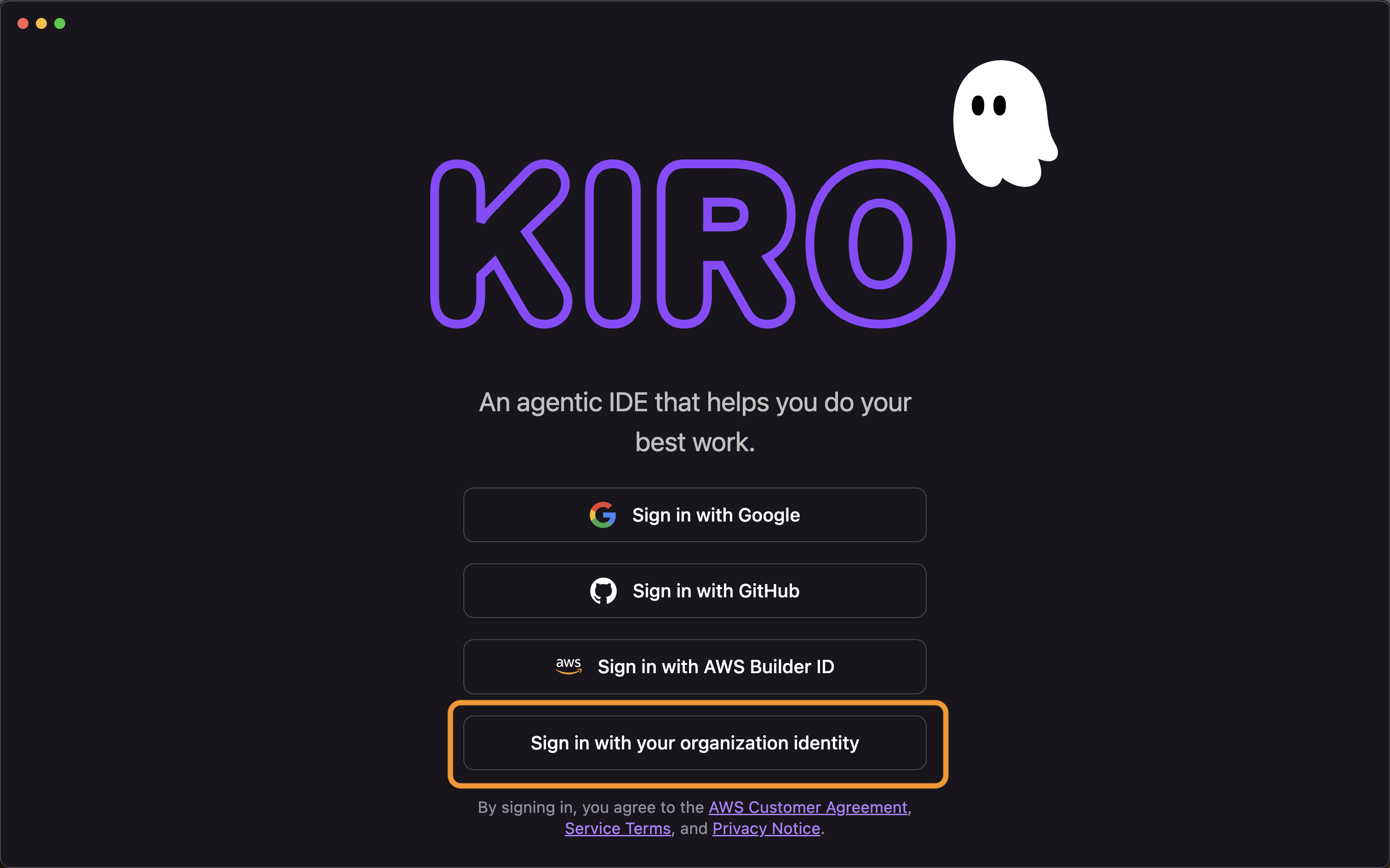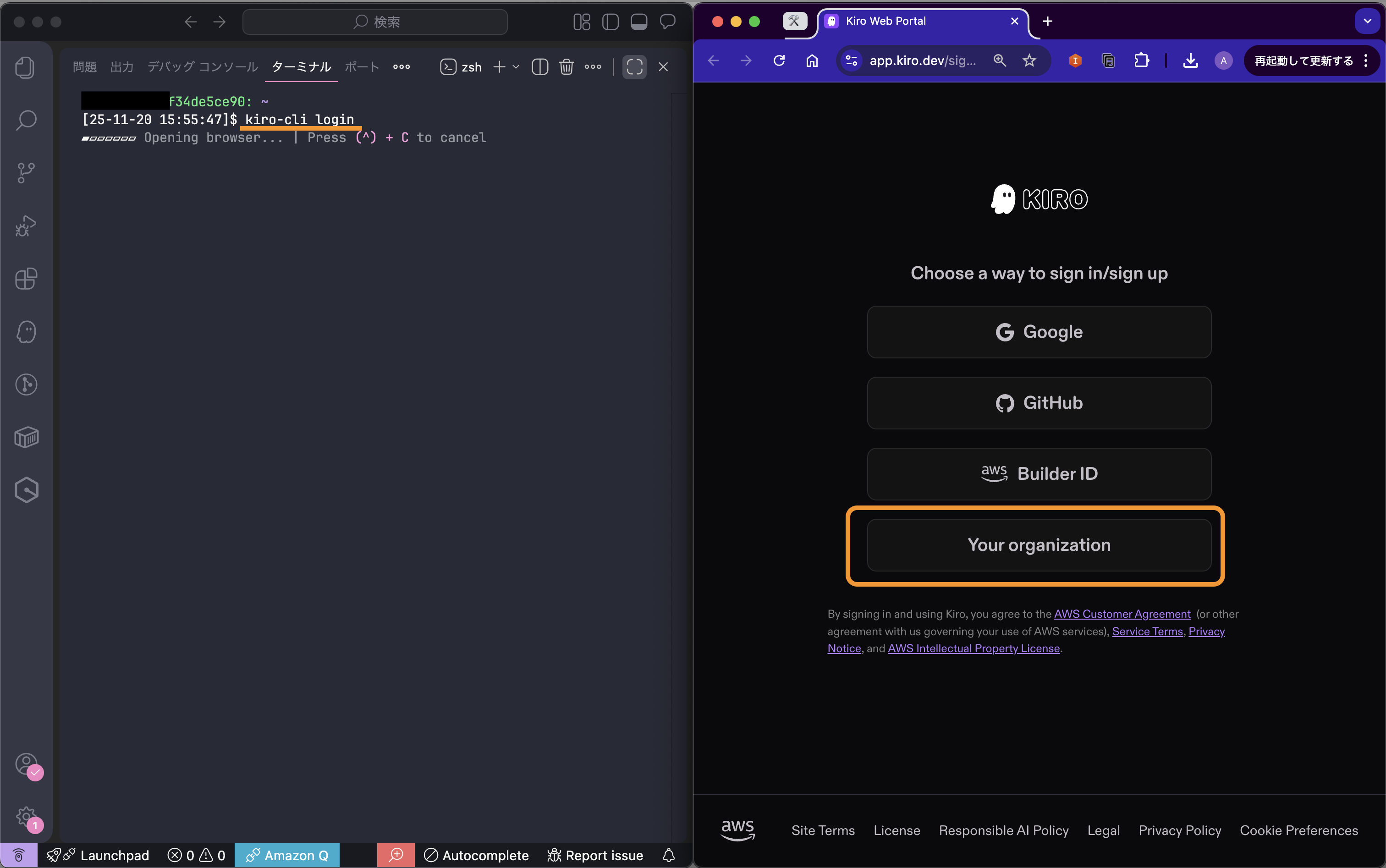 Kiro コンソールからサブスクリプションが開始された、IAM Identity Center ユーザーは、「Sign in with your organization identity」から IDE にログイン、もしくはコマンドラインで kiro-cli login コマンドを利用して IAM Identity Center の認証情報を用いて Kiro CLI にログインし、Kiro の利用を開始することができます。