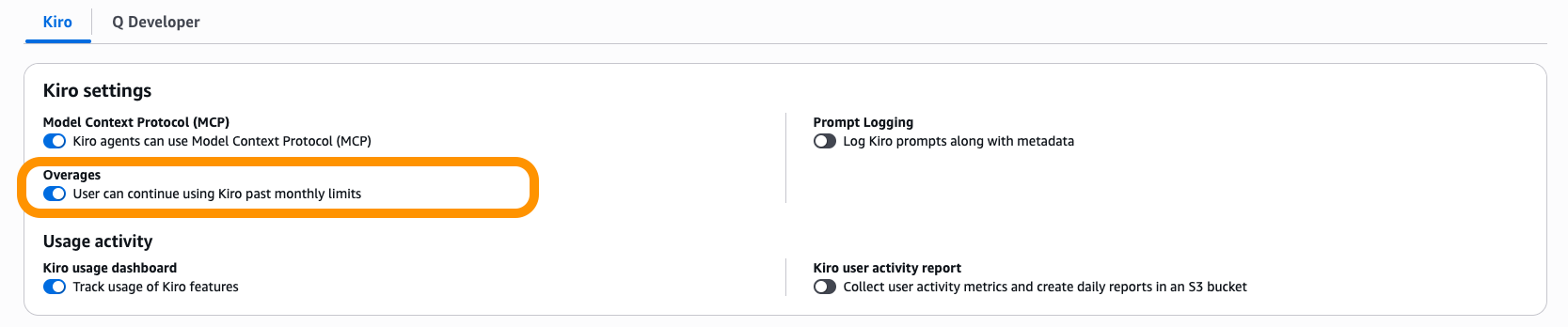 Kiro では、月のクレジット制限を超えて Kiro を利用可能にする Overage(超過料金)がサポートされています。Kiro の月の制限に達した場合、Overage が有効化されていると、0.04 USD/クレジットで制限を超えて Kiro の機能を引き続き利用することができます。デフォルトで Overage は無効化されています。