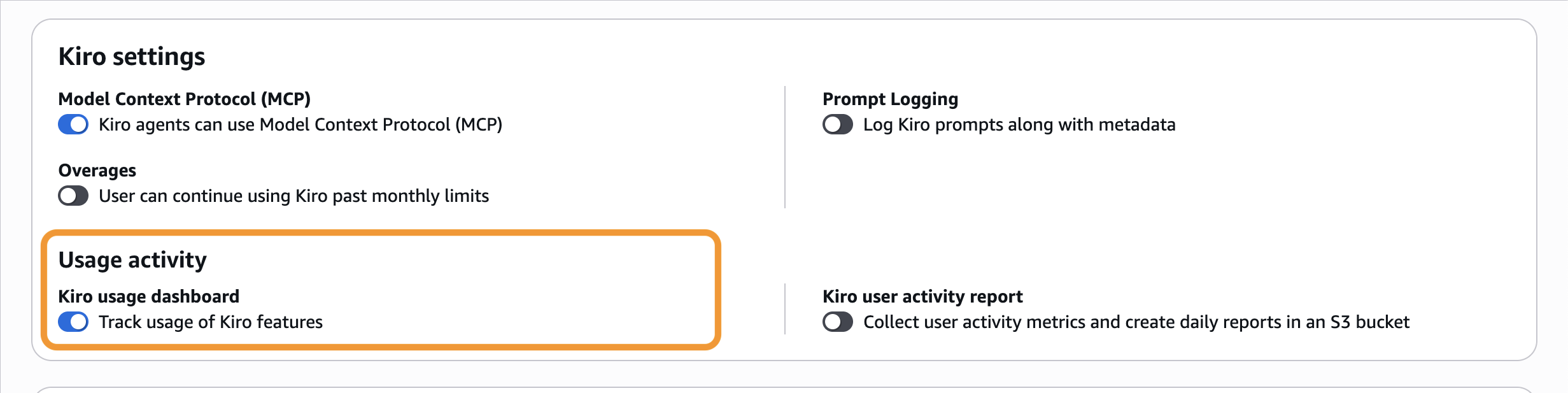 Kiro コンソールのセッティングにて、Kiro usage dashboard を有効化することができます。