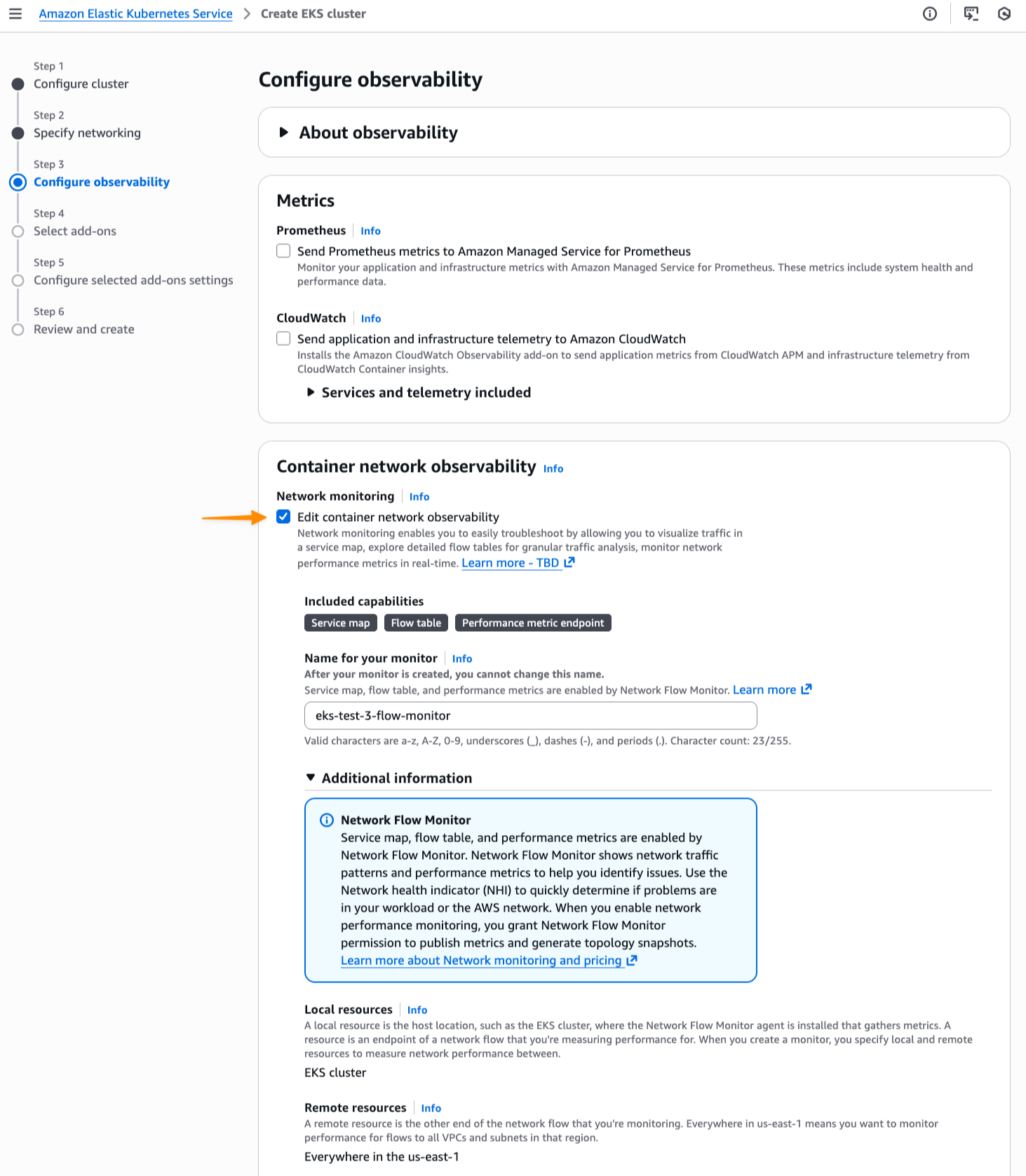 この新特徴量は、新規または既存の EKS クラスターで有効にできます。新しい EKS クラスターの場合、[Configure observability] (オブザーバビリティを設定) のセットアップ中に、[Configure network observability] (ネットワークオブザーバビリティを設定) セクションに移動します。ここでは、[Edit container network observability] (コンテナネットワークオブザーバビリティを編集) を選択します。サービスマップ、フローテーブル、パフォーマンスメトリクスエンドポイントの 3 つの特徴量が含まれていることがわかります。これらは Amazon CloudWatch Network Flow Monitor によって有効になっています。