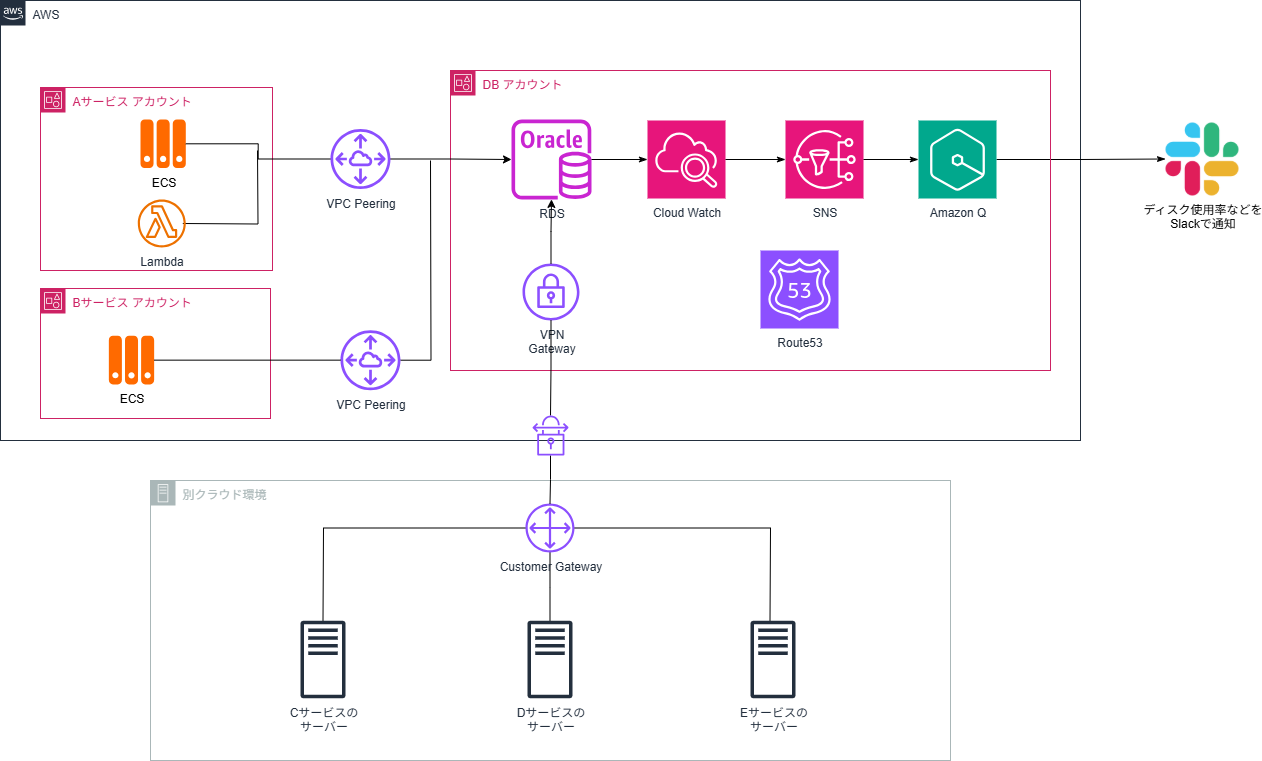 ニフティの回線サービスに関するデータ ( 顧客の申込情報や契約進捗状況など ) は、統合データベースで一元管理されています。このデータベースには、各回線サービスシステムからアクセスが可能です。システムは AWS だけでなく、他のクラウド環境にも構築されているため、VPN 経由でアクセスが行われます。