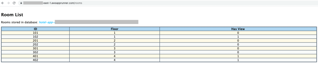 下記は、データベースに接続するシンプルな Node.js ウェブアプリケーションです。このアプリケーションでは、Amazon RDS でホストされた MySQL/Aurora へホテルの部屋情報を格納します。アプリケーションへ HTTP(S) の GET 及び POST リクエストを送信し、部屋情報を取得及び更新することができます。Amazon RDS データベースは、VPC 内からのみアクセス可能です。テーブルを作成し、アイテムやリストアイテムを追加できます。下記は、hotel-app/app.js のソースコードです。