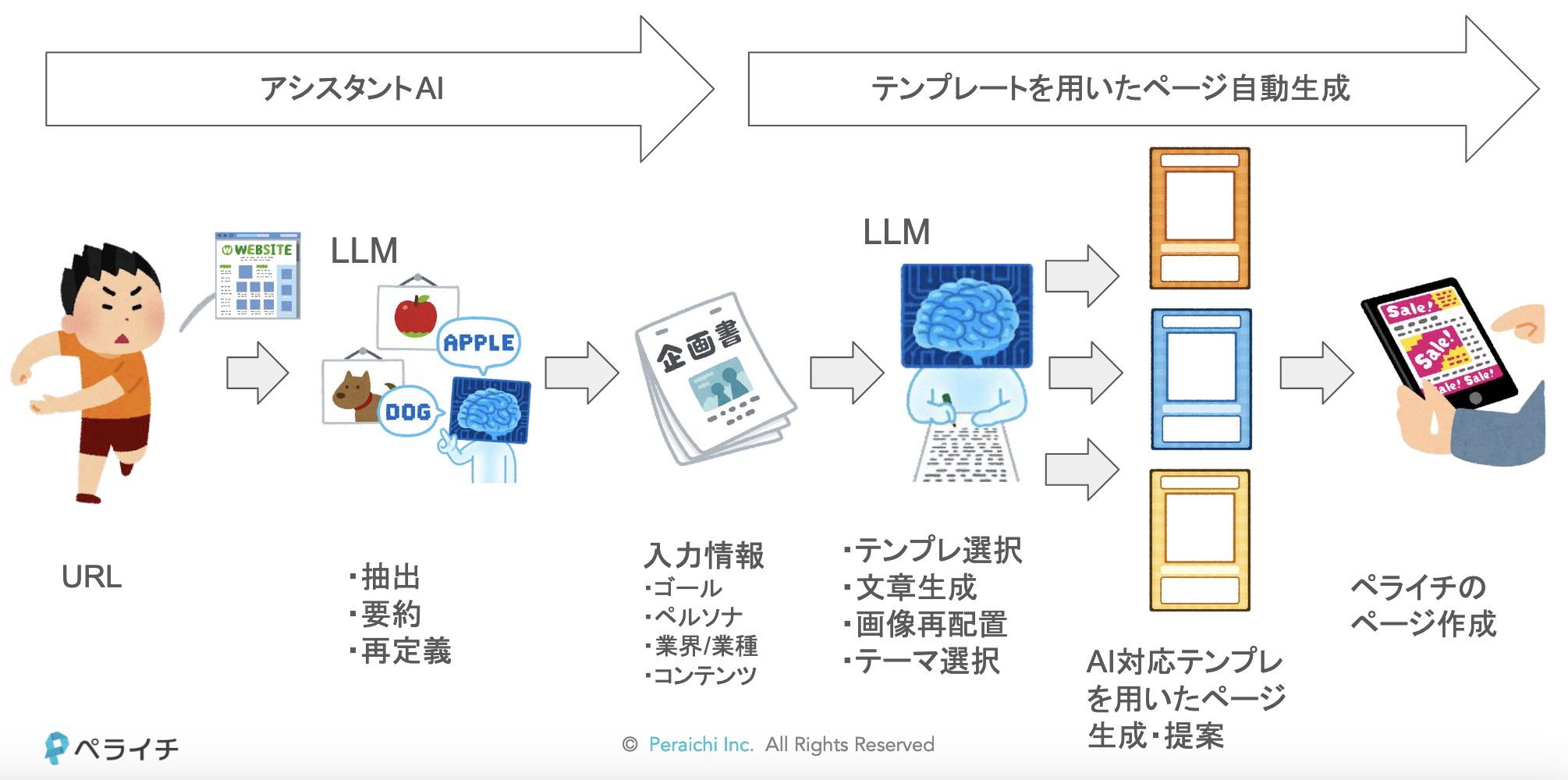 今回はこれらの課題に対して、入力情報としてサイトの URL 情報を与えそこからユーザーのビジネスや商材、ユースケースなどの情報を AI で抽出・要約し、それらの情報を元にしてペライチの既存テンプレートを組み合わせてページを生成することを試みました。「ユーザーが持つ古いページを作り直すケース」や「ユーザーが持つ既存の EC 販売サイトとは別に独自の EC サイトを立ち上げたい」などといったユースケースを想定しています。インプット情報を少なくし、そこから AI を用いてペライチのサービス側でユーザーに必要な情報を抽出・推論することで、今まで人間がサポートしていた部分を一部生成 AI によって置き換えて、ユーザーの制作コストやリードタイムを削減しようとしています。