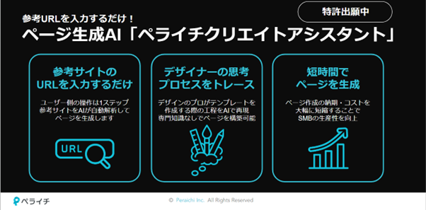 こうしたお客様の課題を解決するため、AIの力を活用してより簡単にホームページを作成できる「ペライチクリエイトアシスタント」を開発しました。この機能では、ユーザーが任意のサイトのURLを入力するだけで、そのサイトの特徴や用途に応じた情報を生成AIが抽出し、それに基づいた最適なテンプレートでサンプルのホームページを提案します。