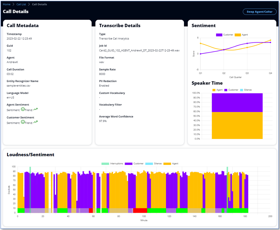 - Customer Sentiment and Customer Sentiment Trend — 全体的な発信者のセンチメントと、発信者が通話開始時よりも終了時の方が好意的だったかどうかを示します