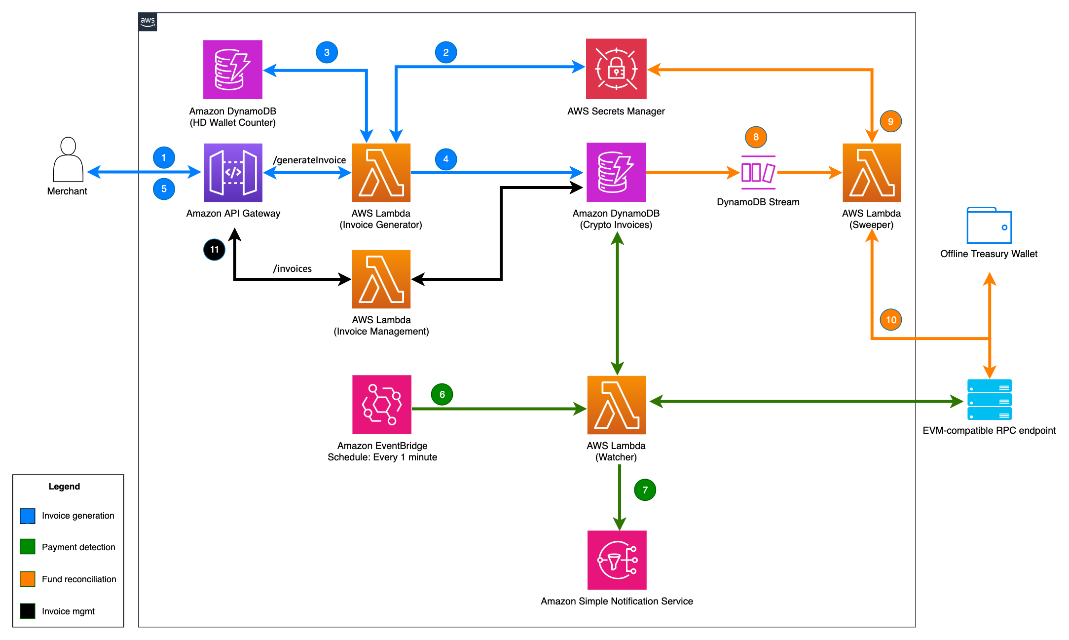 - 確定的な請求書生成 – 請求書ジェネレーターは、請求書とブロックチェーンアドレスの 1 対 1 のマッピングを容易にします。これにより、各支払いが対応する請求書に正しく紐付けられることが保証されます。このシステムは、アトミックカウンターを Amazon DynamoDB に保存してウォレットインデックスを維持し、高い同時実行シナリオでもスレッドセーフなアドレス生成を維持します。