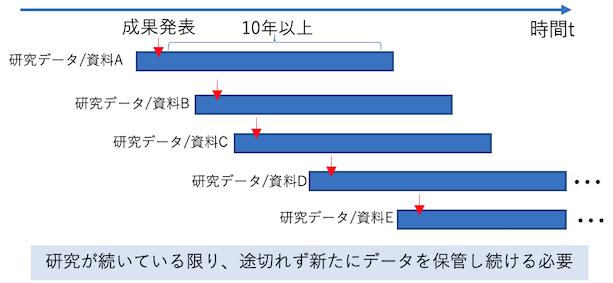 学術研究機関においては研究不正対策なども含め、研究データや関連資料の長期保存が必要となってきています。日本学術会議から公開された文章においても論文の実験データ等の資料は原則論文発表後10年保存することが必要であるとされています。