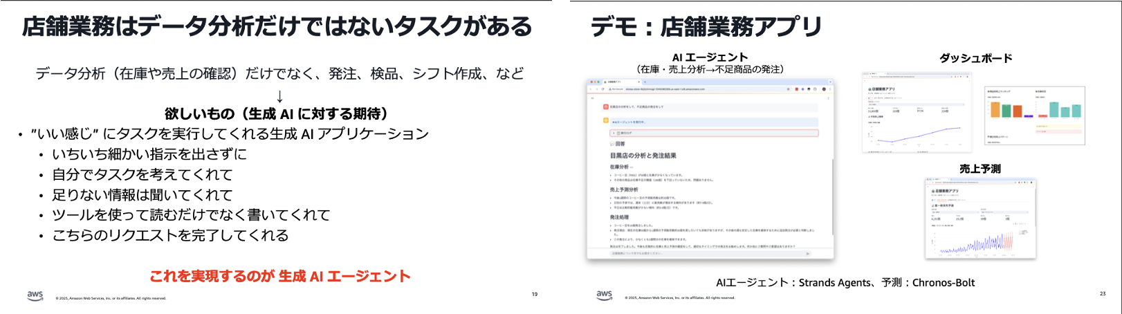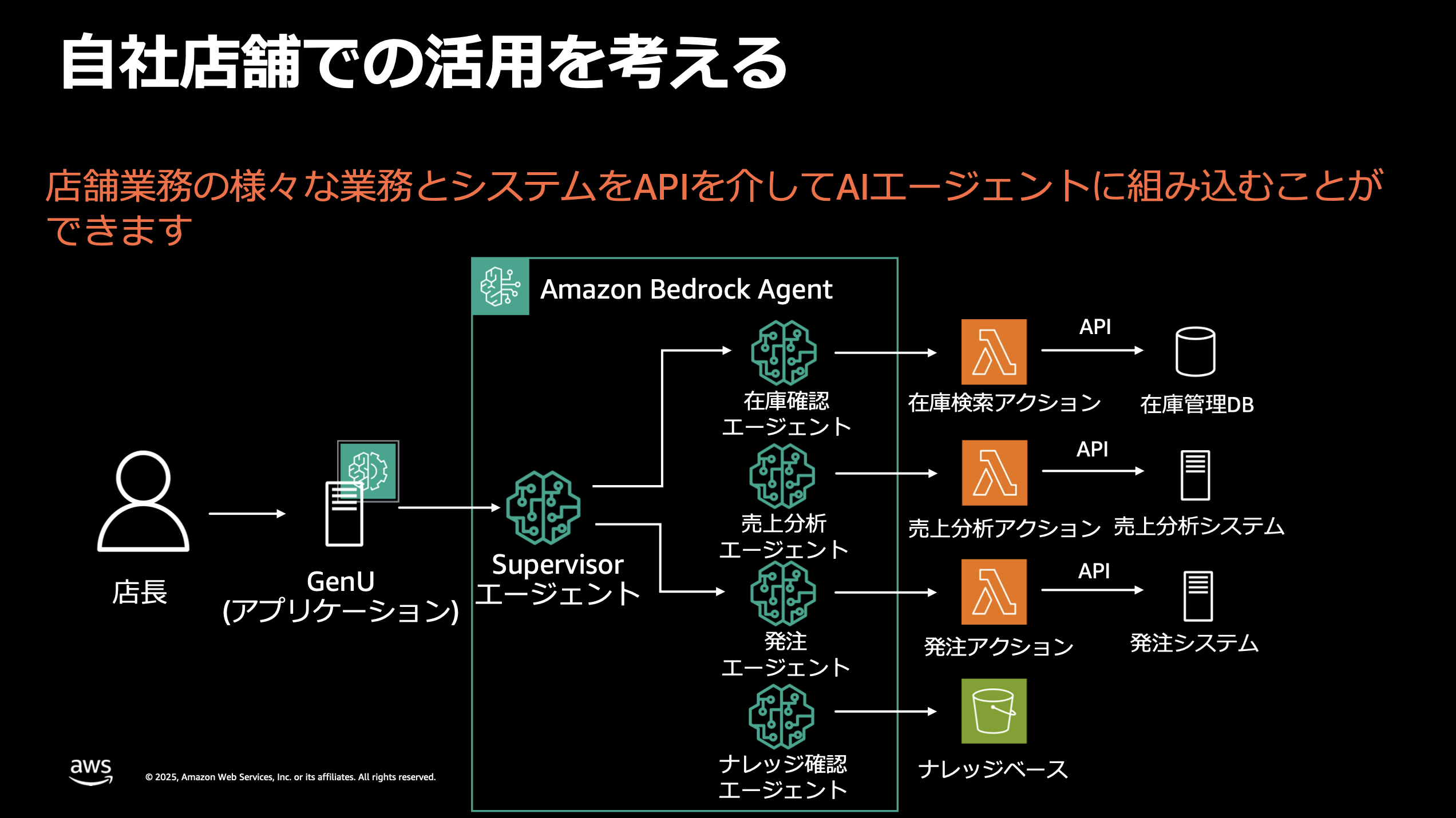 ハンズオンでは、店舗業務で重要な在庫管理と売上分析する AI エージェントの構築を体験いただきました。AI エージェントは独自の在庫管理 DB や売上分析システムと連携した処理を行うことができます。参加者は、ノーコードで AI エージェントを開発できる Amazon Bedrock Agents を利用し、在庫確認を行うエージェントと売上分析を行うエージェントを作り、そして、これらのエージェントと連携し取りまとめる Supervisor エージェントを構築しました。さらに、GenU から Supervisor エージェントを呼び出せるように設定することで、 Web アプリケーションから自然言語で店頭在庫の確認や売上分析を行えるチャット環境を短時間で構築いただきました。AI エージェントがユーザーからのリクエストを理解してタスクを細分化し、業務特化のエージェントと連携して、複合的な処理を完結できるということを体験いただきました。