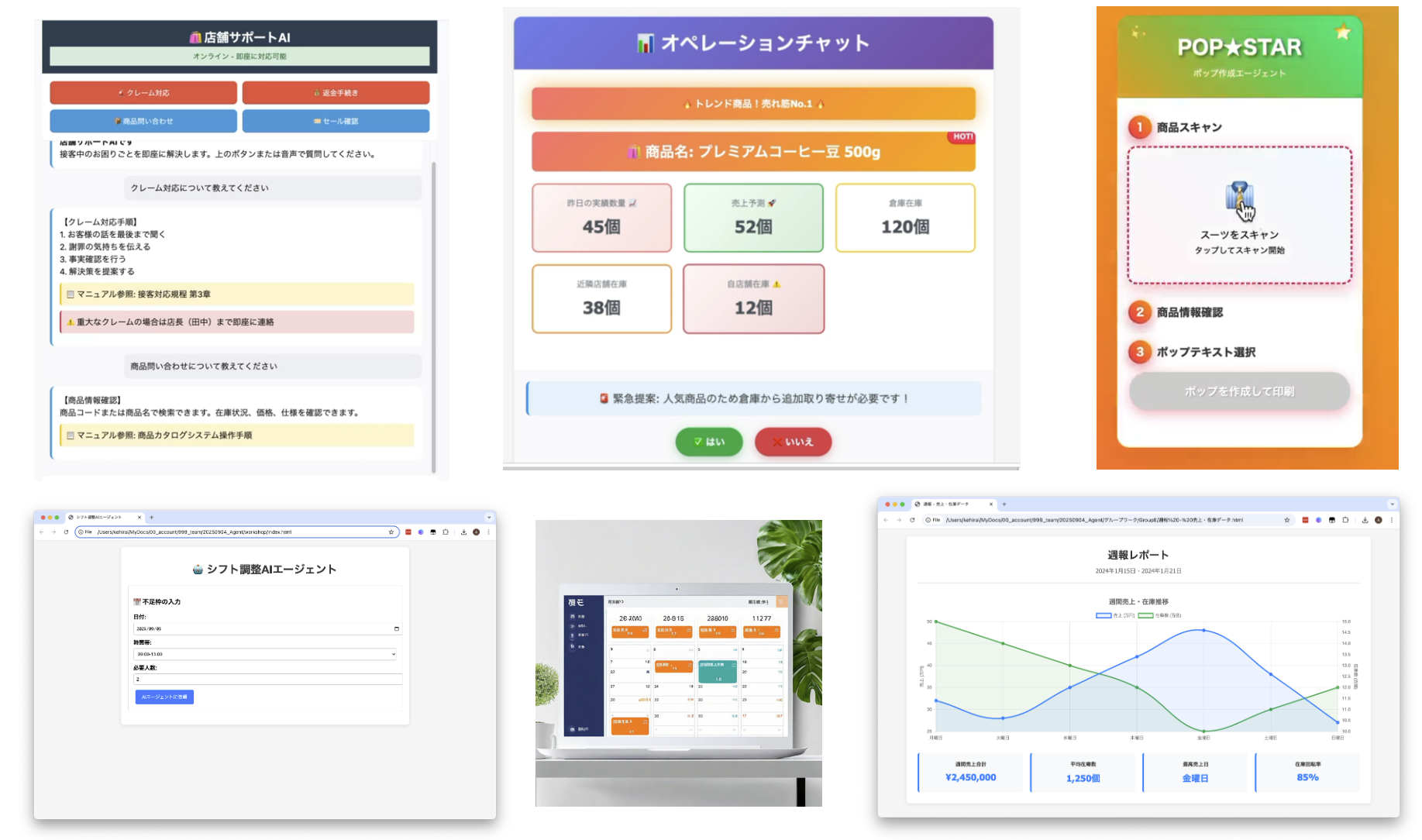 ワークショップを通じて、各グループ計 6 つの具体的なユースケースを特定することができました。ユースケースの内訳として、店長視点のものが 3 つ(売れ筋商品の補充発注、シフト変更調整、週報の作成)、店舗スタッフ視点のものが 3 つ(店舗コンシェルジュ、商品ポップ作成、滞留在庫商品の広告作成)でした。偶然にもグループ間でテーマの被りがなく、何よりどのグループも議論と実装で盛り上がり、もっと時間が欲しかったというコメントをたくさんいただきました。これは、テーマを店舗業務に絞ったことの効果と AI ツールの活用、そして企業をまたぐお客様同士のコミュニケーションによって、お客様の気づきと満足度に大きく寄与したものと考えています。お客様の声に耳を傾けて、今後も期待に応える企画を考えてご提供していきます。