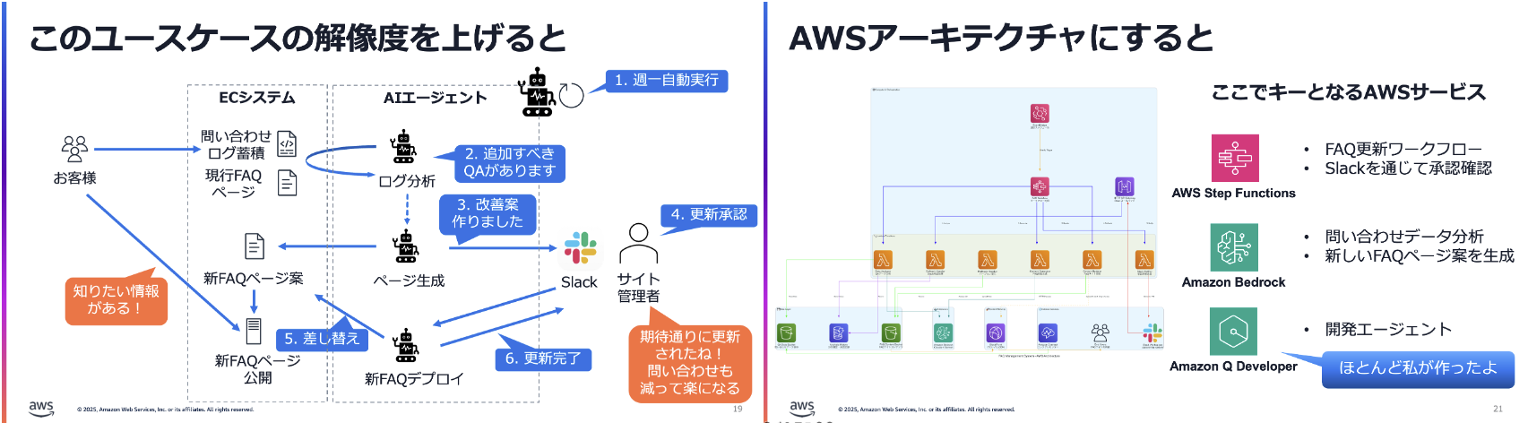 「ユースケースの解像度が高ければ、実用的な AI アプリは作れる」ということを体験いただくため、店舗業務を効率化する AI エージェントを具体化するハッカソンを行いました。現実世界の業務には、単純なワークフローもあれば、複雑な処理の分岐や判断を必要とするケースなど多岐に渡り、それぞれの業務フローに対して AI はどのように機能できるか、人間との役割分担はどうあるべきか、について問いかけました。AI から人間に判断を求めるユースケースの具体例として、FAQ ページを更新する AI エージェントのデモをお見せし、これを実現する AWS アーキテクチャの概要と、 実は Amazon Q Developer がほぼ全て開発したことについて触れ、ユースケースの解像度が高ければ、開発自体のハードルは今はかなり低いということを説明しました。