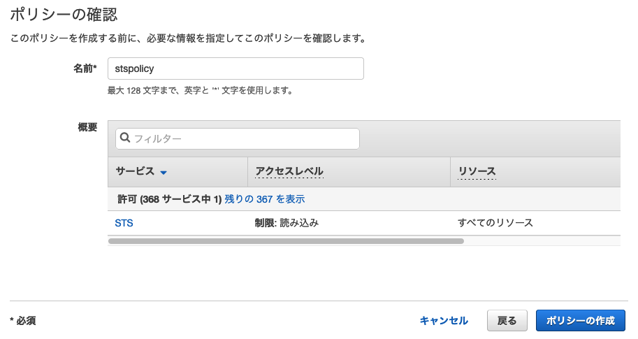 「ポリシーの確認」をクリックし、名前を入力して「ポリシーの作成」をクリックします。