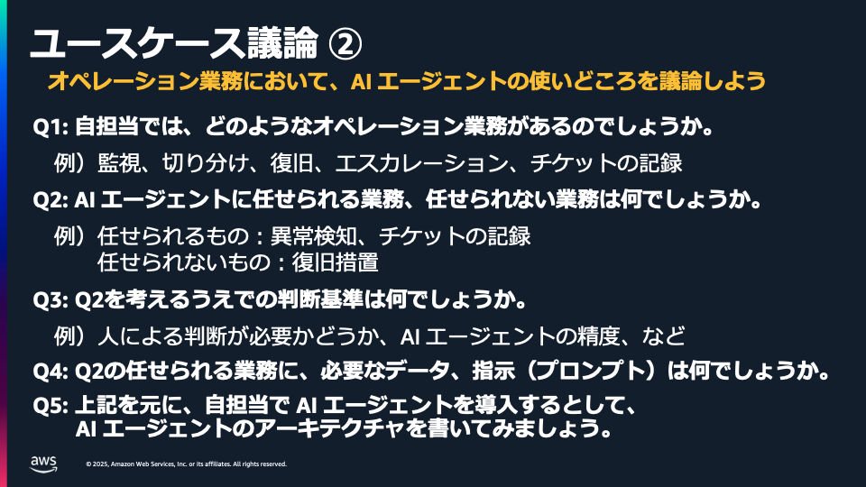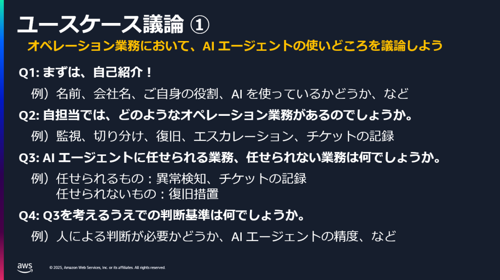 本イベントは、複数社の運用担当者にご参加いただいたので、各社混合のグループディスカッションを AWS 社員も交えて実施いただきました。議論テーマは、以下です。各社、自担当の業務をご紹介いただき、どのような業務を AI エージェントに任せられるのか、を議論いただきました。AI エージェントに任せられる業務としては、調査、分析、切り分け、オペレータの支援、ドキュメント作成、オペレーションの記録、ネットワークのエッジ側での操作、などが挙げられ、任せられない業務としては、サービス影響の出る可能性のあるオペレーションの実行、顧客対応や社内調整など対人コミュニケーション関連の業務が挙げられました。各社の AI 活用状況や運用の現場における課題の共有、活発な意見交換が行われました。