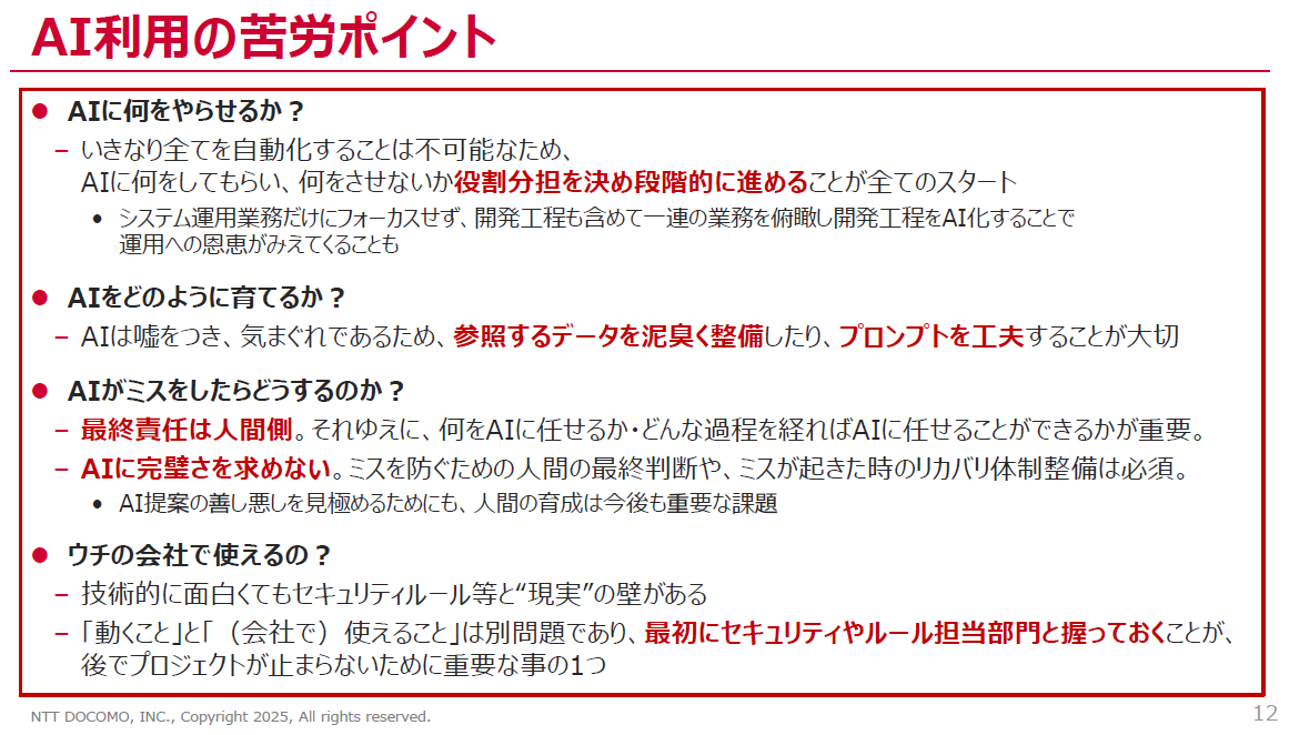 実際の AI エージェントの開発では、参照するデータを泥臭く時間をかけて整備し、プロンプトを工夫することが精度向上には必要であることや、AI に完璧さを求めないこと、がリアルな実装のポイントとして挙げられました。将来的には、LLM 適用による維持管理業務への AI エージェントの適用を行い、AI エージェントの適用領域のさらなる拡張を進め、自律レベルの向上を目指しています。