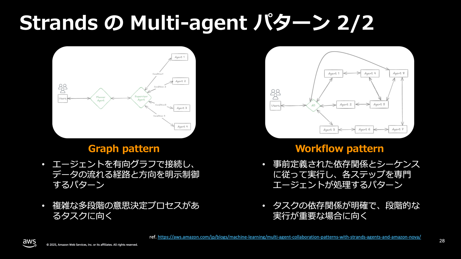 Autonomous Network の自律レベル向上を目指していくにあたっては、単一の AI エージェントによるタスク処理だけではなく、マルチエージェントによる協調の必要性が高まってくるでしょう。異なるスキルやモダリティをもつ、複数の専門化された AI エージェントを効果的に組み合わせるデザインパターンとして Agents as Tools、Swarm、Graph、Workflow の4つをご紹介しました。