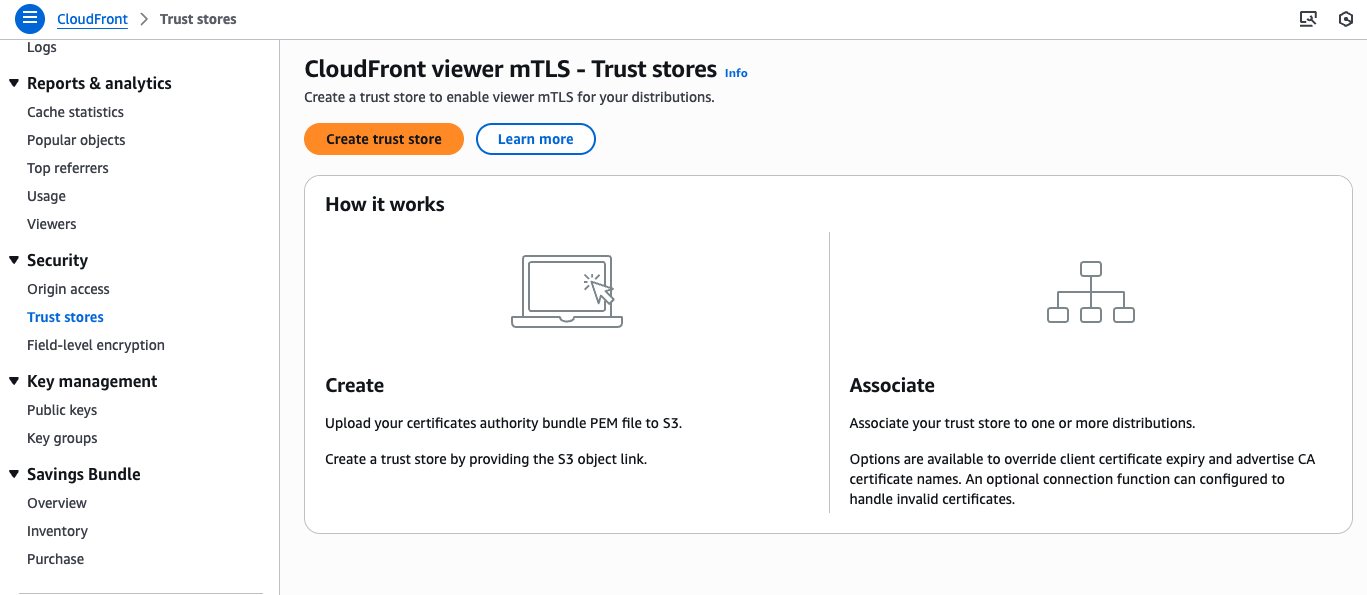 1. CloudFront コンソールで、左側のメニューの Security の下にある Trust Store を選択します。Create trust store を選択します。