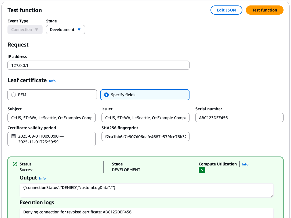 5. Test タブで、作成した関数をテストできます。証明書情報と KeyValueStore に追加したシリアル番号を入力します。次に、Test function を選択して、証明書が適切に失効することを確認します。