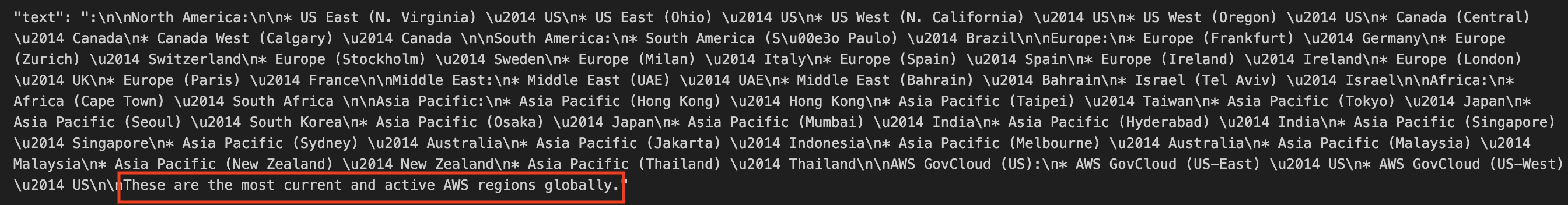 이제 AWS 리전 목록이 표시됩니다. 맨 끝에 “여기 표시된 것이 전 세계 최신, 활성 AWS 리전입니다.”라는 메시지가 표시됩니다.