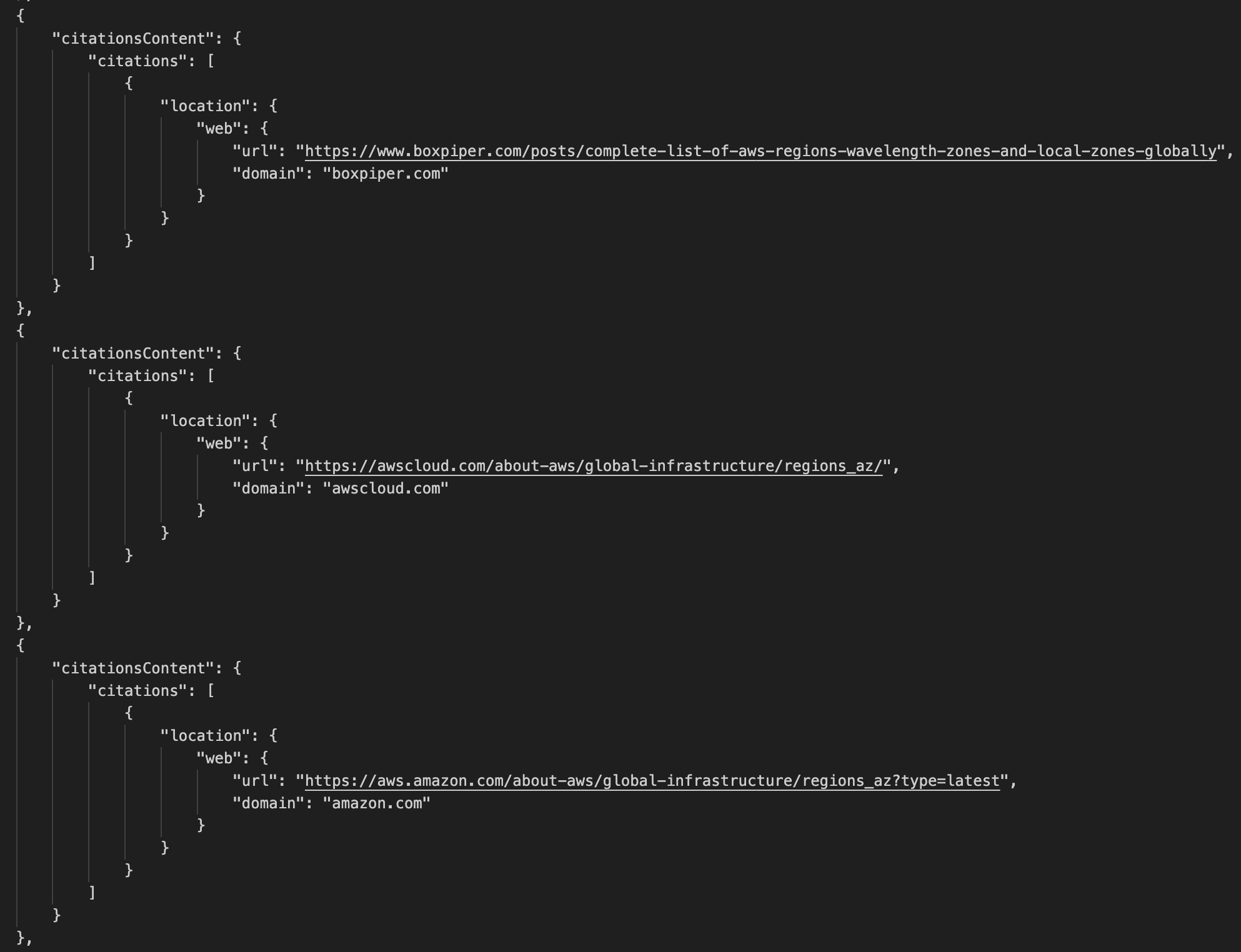 또한 출력에는 Web Grounding이 쿼리한 소스에 관한 정보가 포함된 citationsContent 객체도 포함됩니다.