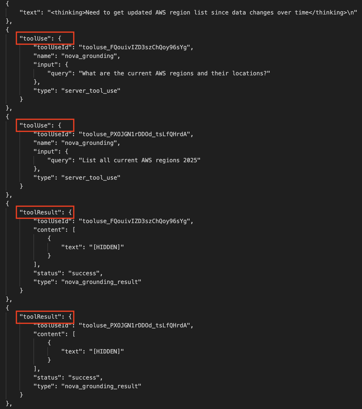 이제 Web Grounding을 사용해 보겠습니다. 아까와 비슷한 Amazon Bedrock Converse API를 호출하되, nova_grounding을 모델이 이용할 수 있는 도구로 선언합니다.