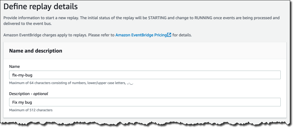 replay-name필드가 포함되어 있습니다. 재생을 시작할 때 시간 프레임을 정의하면 해당 시간 프레임 내의 이벤트만 재생됩니다. 현재 아카이빙된 이벤트 버스와 동일한 이벤트 버스에 대해서만 이벤트를 재생할 수 있습니다.