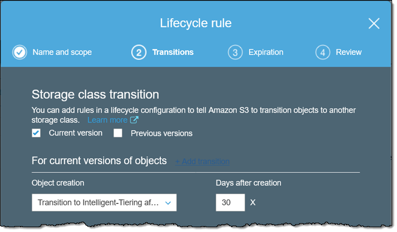 Intelligent-Tiering을 사용하는 수명 주기 규칙을 생성할 수 있습니다.