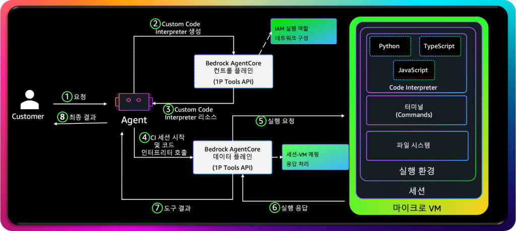 System Code Interpreter는 Amazon Bedrock의 데이터 플레인(Data Plane)을 통해 동작합니다. 고객이 요청을 보내면, LLM 기반 에이전트가 해당 요청을 분석하고 코드 실행이 필요한 경우 자동으로 Code Interpreter 세션을 시작합니다. 이때 Bedrock AgentCore는 내부적으로 Firecracker 기반의 마이크로 VM(Micro VM) 을 할당하여 각 실행 세션을 완전히 격리된 환경에서 처리합니다. 이 격리 구조는 코드 실행 중 발생할 수 있는 보안 위험, 데이터 누출, 또는 외부 네트워크 접근 문제를 원천적으로 차단합니다.