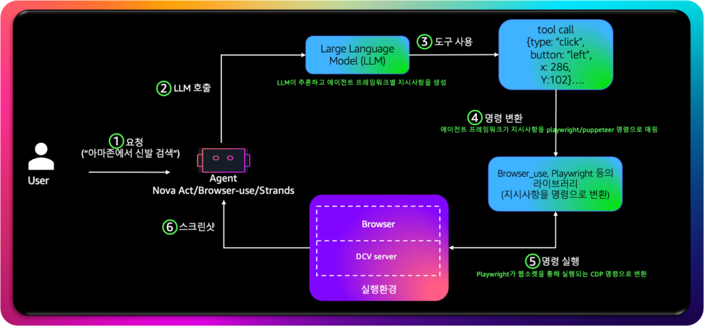 사용자가 자연어로 명령이나 질문을 입력하면(① User Prompt), 이 입력은 Agent로 전달됩니다. 에이전트는 입력을 분석한 뒤, 적절한 처리 방식을 결정하기 위해 LLM 을 호출합니다(②). 이때 LLM은 주어진 프롬프트를 바탕으로 에이전트 프레임워크에 맞는 지시사항을 추론하고 생성합니다. LLM이 생성한 지시사항 중 웹 탐색이나 최신 정보 수집이 필요한 경우, Browser Tool이 활성화되며(③) Browser Tool은 실제 웹 리소스를 탐색하고 필요한 데이터를 수집하는 역할을 수행하게 됩니다. 이 과정에서 DCV 서버와 브라우저 세션이 함께 작동하여 안전하게 외부 데이터를 가져올 수 있습니다. 한편, 데이터 분석이나 계산, 검증이 필요한 경우에는 Code Interpreter Tool를 호출합니다(④). 이후, Browser Tool과 Code Interpreter Tool의 실행 결과는 다시 Context Merger로 전달되어(⑤) 새로운 컨텍스트로 병합됩니다. 병합된 컨텍스트는 에이전트의 다음 추론 과정에 반영되어, 보다 정교하고 맥락적인 응답을 생성할 수 있습니다.