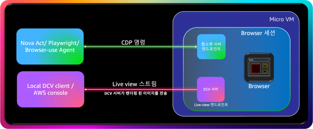 이 방식은 브라우저 자동화를 전체 에이전트 생태계에 자연스럽게 통합할 수 있는 구조입니다. Strands가 고수준 의사결정과 워크플로우 조정을 담당하고, Nova Act가 신뢰도 높은 브라우저 실행을 담당함으로써 대규모 멀티에이전트 시스템에서도 일관된 동작을 유지할 수 있습니다. 이는 기업 내부에서 브라우저 기반 시스템과 여러 에이전트가 연동되어야 하는 실제 운영 환경에 매우 적합합니다.