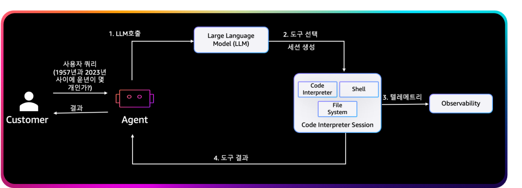 사용자의 자연어 명령이 Bedrock 에이전트에 전달되면, AgentCore는 이 명령을 분석하여 “Code Execution Tool” 호출이 필요한지를 결정합니다. 예를 들어 사용자가