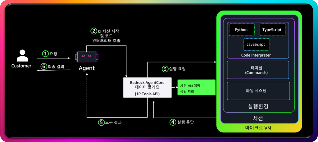 System Code Interpreter는 Amazon Bedrock의 데이터 플레인(Data Plane)을 통해 동작합니다. 고객이 요청을 보내면, LLM 기반 에이전트가 해당 요청을 분석하고 코드 실행이 필요한 경우 자동으로 Code Interpreter 세션을 시작합니다. 이때 Bedrock AgentCore는 내부적으로 Firecracker 기반의 마이크로 VM(Micro VM) 을 할당하여 각 실행 세션을 완전히 격리된 환경에서 처리합니다. 이 격리 구조는 코드 실행 중 발생할 수 있는 보안 위험, 데이터 누출, 또는 외부 네트워크 접근 문제를 원천적으로 차단합니다.