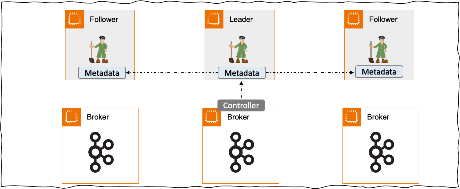 전통적인 Apache Kafka는 Apache Zookeeper를 사용하는 아키텍처로 Apache Zookeeper를 메타데이터 관리를 위해 사용합니다. 메타데이터는 Kafka 클러스터의 Topic의 구성 정보, 브로커의 목록, 파티션 리더 정보 등을 저장하고 있습니다. 브로커 중 하나는 Zookeeper와 통신하는 컨트롤러 역할을 하며 이 브로커는 Zookeeper을 통한 메타데이터들을 다른 브로커로 전달하는 역할을 하고 있습니다.