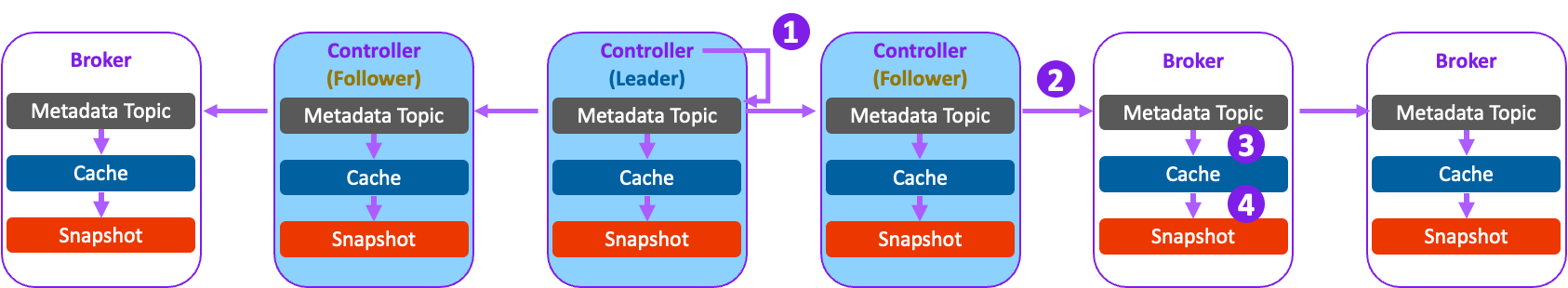- 캐시에 저장된 정보들을 주기적으로 각 Controller와 Broker에 스냅샷 방식으로 저장합니다.