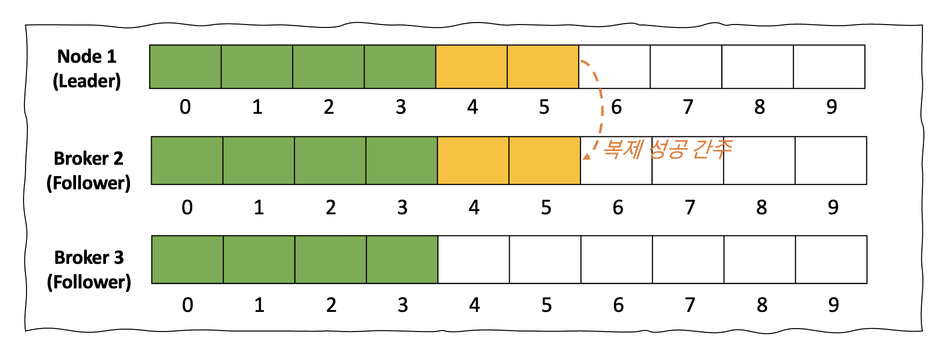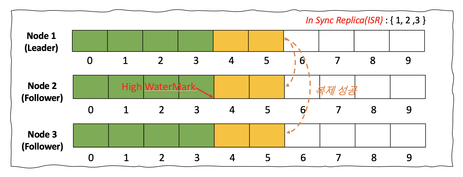 Kafka의 메세지 토픽은 파티션과 복제본의 수로 구성됩니다. 아래와 같이 파티션의 수가 1개이고, 복제본의 수가 3개일 경우로 가정해보도록 하겠습니다. 여러 파티션 중 하나는 리더 파티션의 역할을 수행하게되며 토픽을 바라보는 여러 Producer와 Consumer는 리더 파티션을 기준으로 메세지를 쓰고 읽습니다. 모든 복제본 파티션에 메세지가 정확히 기록될 때 리더 파티션은 복제가 완료된 메세지까지 Commit을 하게 되고 이 지점까지 Consumer에 메세지를 노출하게 됩니다.