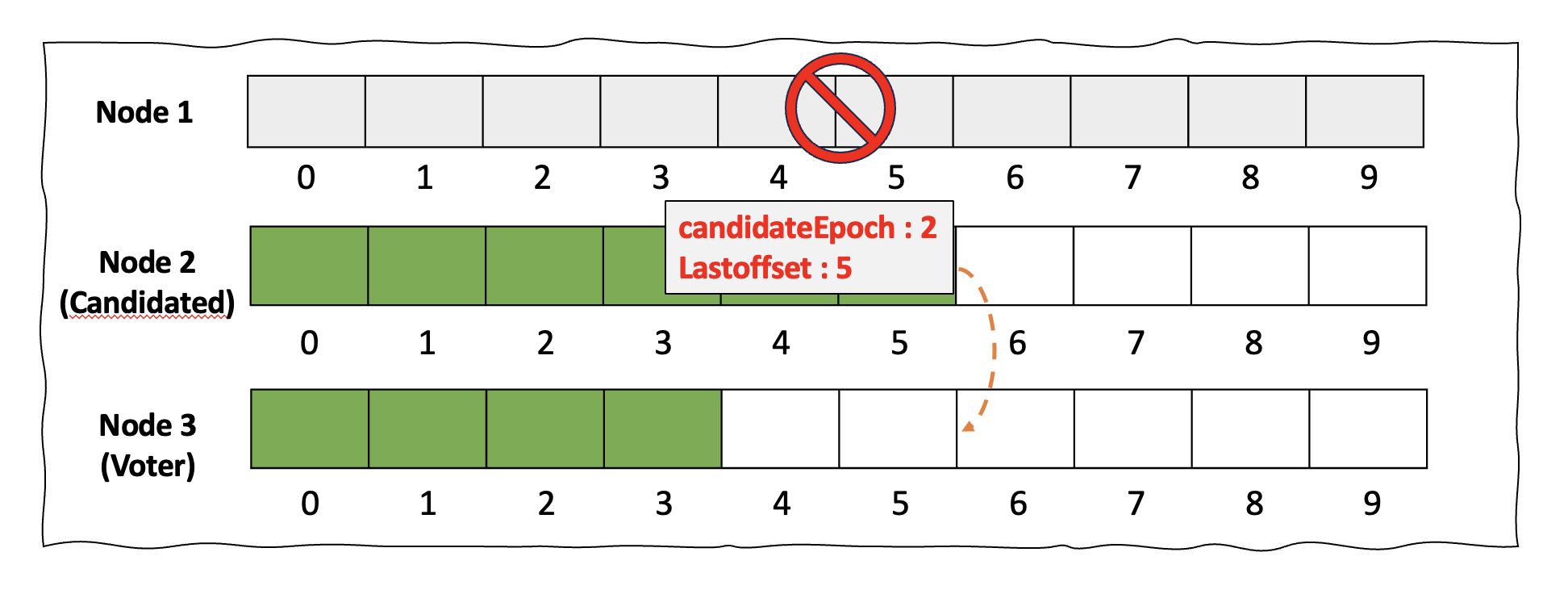기존의 Leader Controller가 셧다운되고 새로운 Controller가 선출되기 위한 과정에 대해 살펴보겠습니다. 기존의 리더 Controller가 셧다운 시 새로운 후보자는 새로운 Epoch 값과 후보자가 갖고 있는 최신 Offset 정보를 투표권자에 전달합니다. 아래의 상황을 예로 들어 보겠습니다. 기존 Leader Controller였던 1번 노드에 셧다운이 발생했습니다. 이때 2번 노드가 후보자가 되었고 이 후보자는 candidateEpoch는 2