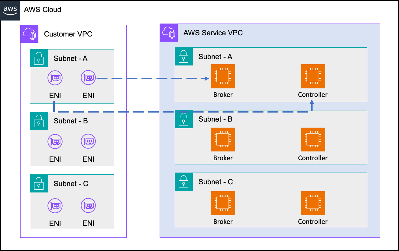 Amazon MSK를 3 곳의 AZ에 3개의 브로커로 생성 할 경우 아래와 같은 그림으로 KRaft 모드의 Amazon MSK 클러스터가 구성되게 됩니다. 고객의 VPC의 각 AZ 별로 Broker와 Controller에 매핑되는 ENI가 생성되며, Broker와 Controller는 AWS 서비스 영역에 배치됩니다. 두 엔드포인트는 아래의 상황에서 사용됩니다.
