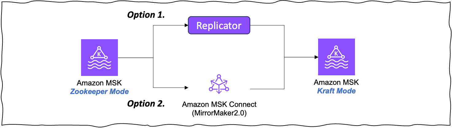 현재 블로그를 작성하는 시점에서는 Zookeeper 방식에서 KRaft 방식으로의 In-place 업그레이드는 제공하지 않습니다. 기존의 Zookeeper 방식의 Amazon MSK을 사용하고 있다면, KRaft 모드인 신규 클러스터를 생성하여 기존 MSK 클러스터의 데이터를 신규 클러스터로 마이그레이션 해야합니다. AWS에서는 Amazon MSK의 데이터 마이그레이션을 위해 아래 두 가지 방식을 지원하고 있습니다.