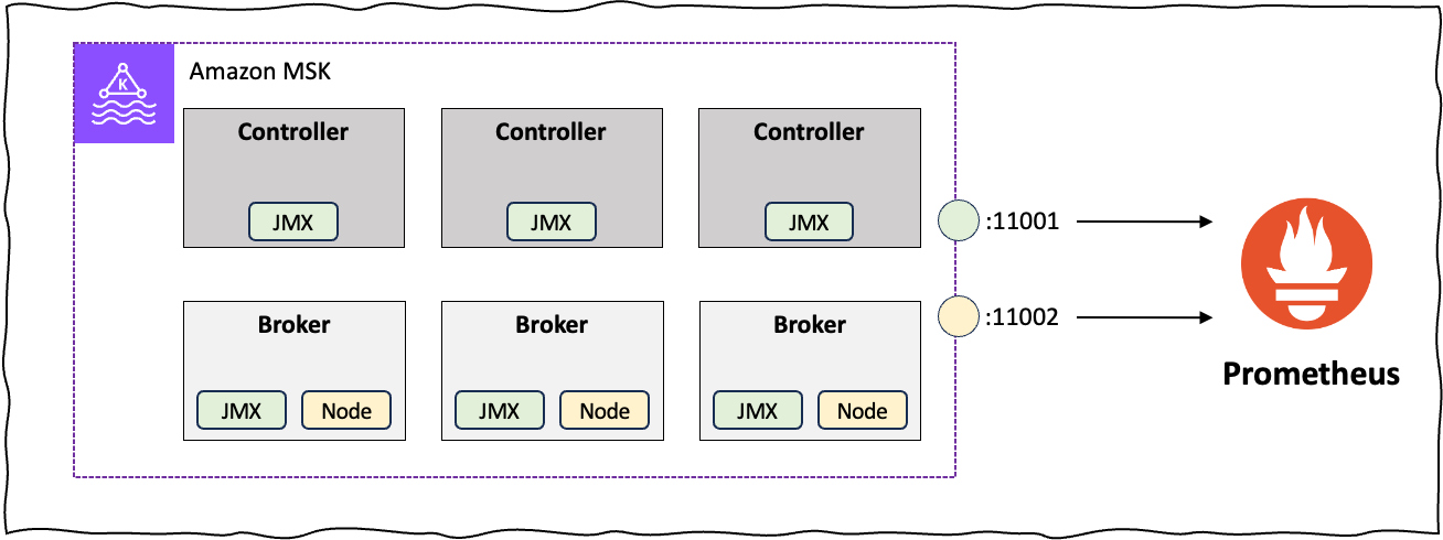 - KRaft 모드의 클러스터를 위한 별도의 CloudWatch 메트릭 정보는 제공하고 있지 않습니다. Controller에 대한 별도의 모니터링이 필요할 경우 오픈 소스기반(Prometheus)을 통해 일부 비컨트롤러에 대한 관련 지표를 수집 할 수 있습니다. Controller에 대한 DNS 정보는 Amazon MSK ListNodes API을 통해 확인 할 수 있습니다.