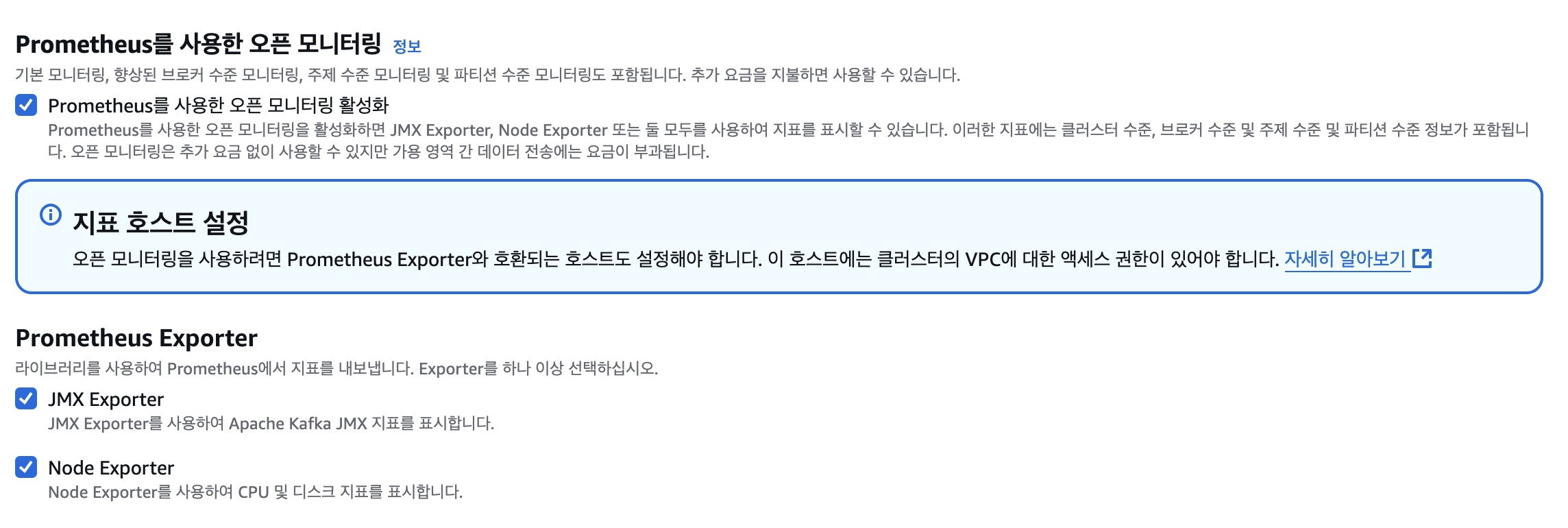 Amazon MSK의 Controller 노드는 CloudWatch 기반의 Metric 정보를 제공하고 있지 않으며, Prometheus와 같은 오픈소스 기반의 Metric 정보를 제공합니다. Kafka Controller 노드에 대한 주요 Metric 지표는 Kafka의 공식 문서에서 확인 할 수 있습니다. Amazon MSK에서 오픈소스 기반의 모니터링을 사용하기 위해서는 아래와 같이 Prometheus를 사용한 오픈 모니터링 옵션을 활성화해야 합니다. Prometheus을 통한 Amazon MSK 모니터링 기능은 별도의 비용은 발생하지 않지만, Cross-AZ로 인한 네트워크 비용이 발생 할 수 있으므로 이를 고려한 모니터링 파이프라인 구성이 필요합니다.