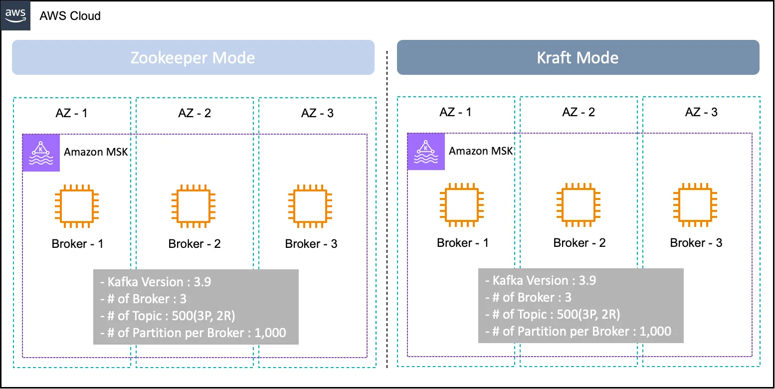 Kraft Mode와 Zookeeper 모드간 벤치마크 테스트를 위해 아래의 환경을 구성합니다.