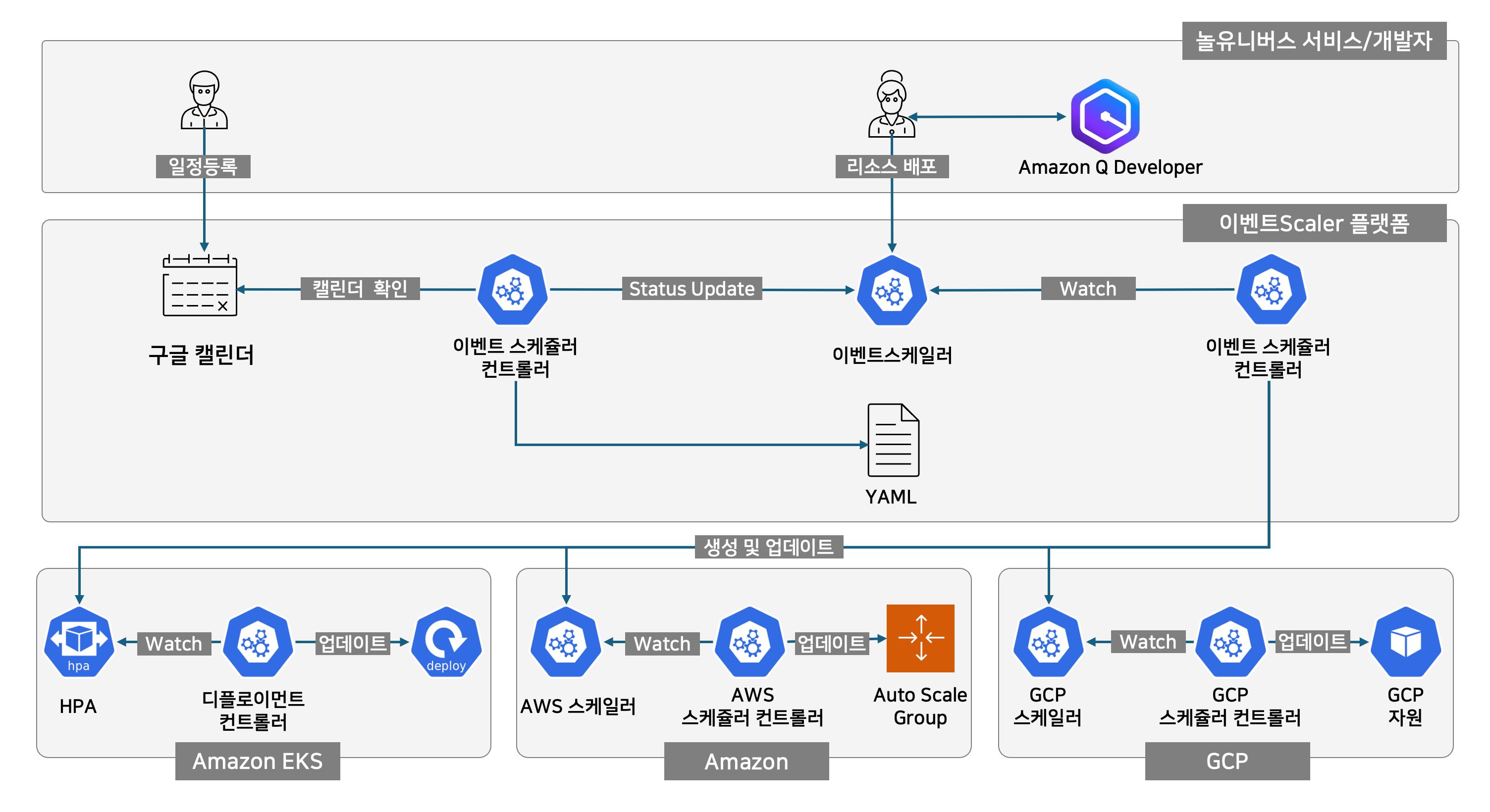 기존 오픈소스 솔루션인 KEDA(Kubernetes-based Event Driven Autoscaler) 등도 검토했습니다. 하지만 KEDA는 메트릭 기반 실시간 반응에 최적화되어 있어 캘린더 기반 사전 스케일링에는 적합하지 않았고, 대부분의 솔루션이 Kubernetes 내부 리소스만을 대상으로 하기 때문에 AWS와 같은 외부 리소스 연동에 한계가 있었습니다.