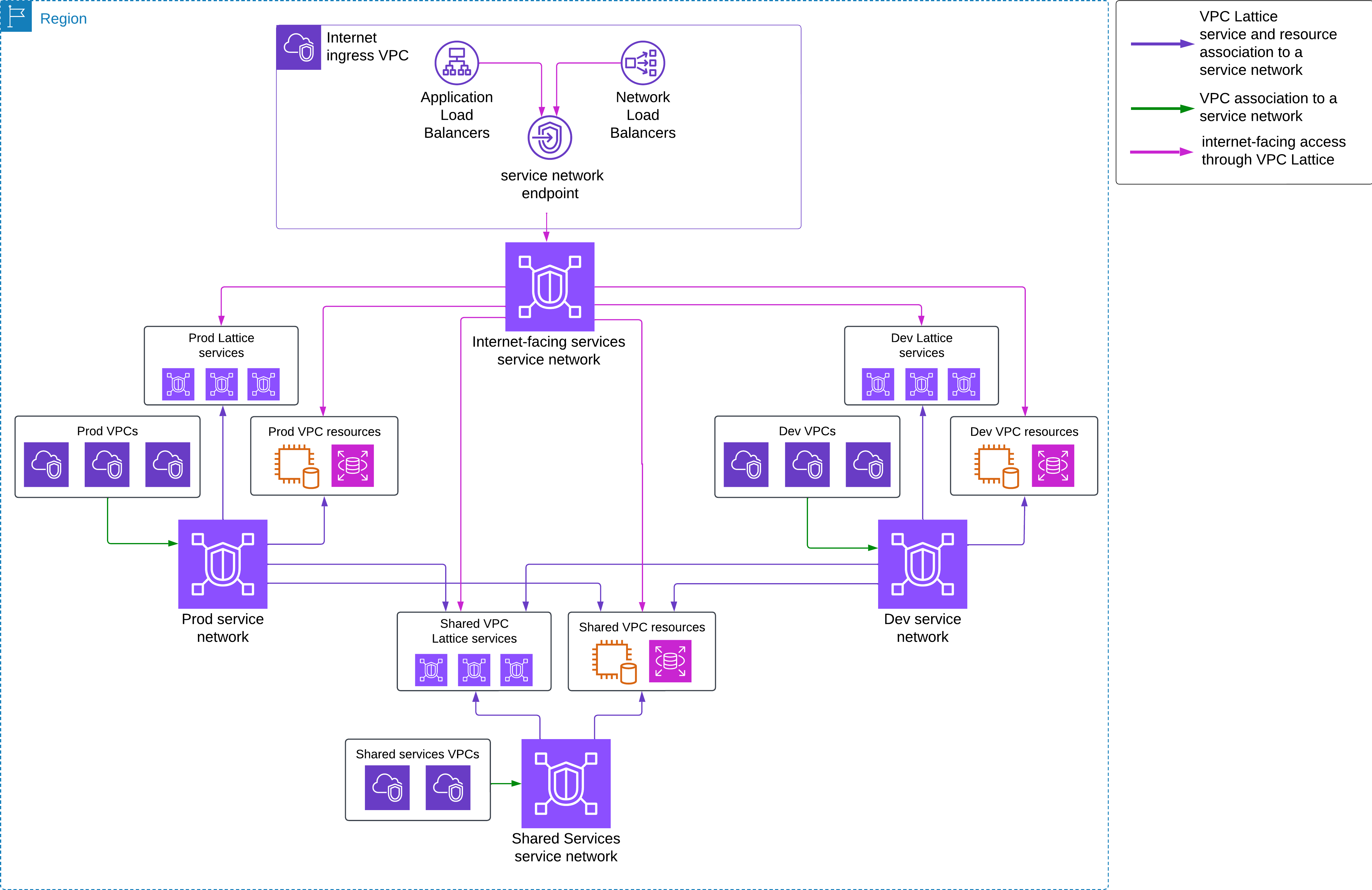 그림 8: Application 또는 Network Load Balancer와 Prod, Dev 및 Shared 서비스 애플리케이션을 위한 서비스 네트워크 엔드포인트를 사용하여 VPC Lattice를 통해 인터넷 연결 애플리케이션 접근하기