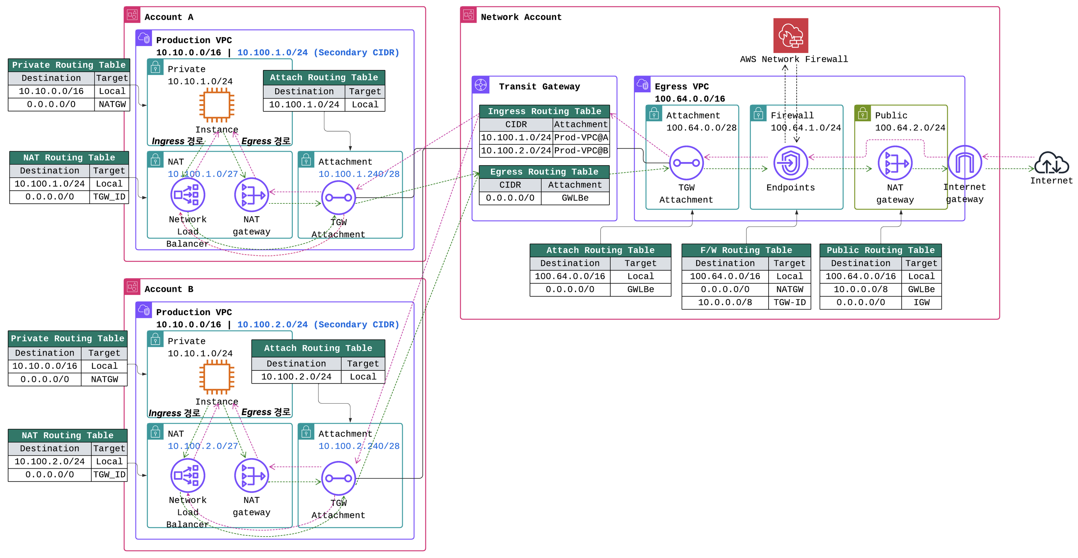 - TGW 라우팅: NAT 처리된 패킷은 TGW Attachment를 통해 Transit Gateway로 전달됩니다.