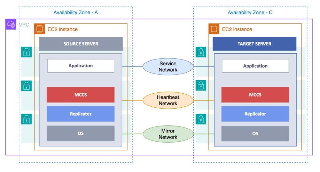 Overlay IP 주소 작업 외에도, 두 EC2 인스턴스간에 Service, Heartbeat, Mirror 를 위한 3개의 네트워크의 구성이 필요합니다. 여기서 Heartbeat 네트워크는 두 EC2 인스턴스간에 서로의 상태를 확인하는데 사용하는 네트워크이며, Mirror 네트워크는 두 EC2 인스턴스간에 로컬 디스크의 데이터를 동기화하고 복제하는데에 사용하는 네트워크입니다. 이러한 네트워크들은 안정적인 이중화 구성을 위해 서로 분리해야 합니다. 네트워크의 분리는 해당 네트워크를 위한 ENI를 서로 다른 서브넷에 위치시키는 방법으로 이루어집니다. 다만, 부득이한 경우에는 Heartbeat와 Mirror 네트워크는 하나의 네트워크로 사용해서 Service 네트워크만 분리 운영 하는 것도 가능합니다.